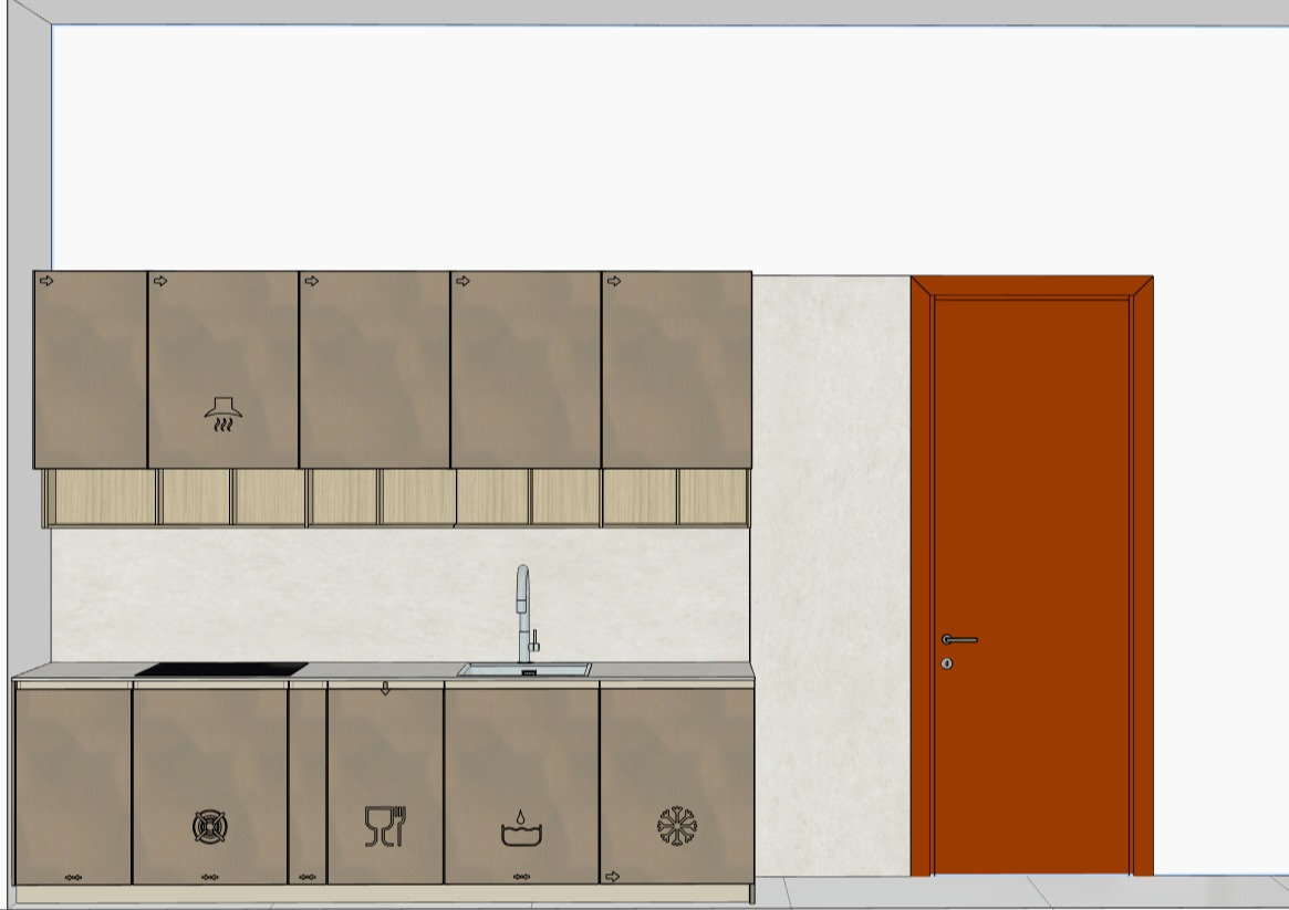 a modern kitchen interior design with a minimalist and elegant style the upper and bottom cabinets are in a champagne metallic paint color with soft brushed texture evoking warmth and sophistication backsplash are in a light beige shade offering contrast and brightness the countertop is a sleek mate beige stone with soft texture no shine no reflection the door on the right is a rich warm terracotta mate finish fine color the faucet is a contemporary metallic silver reflecting a clean and functional aesthetic the overall atmosphere is cozy and inviting with a balanced mix of neutral tones and warm accents soft shadows no handles warm sunlight