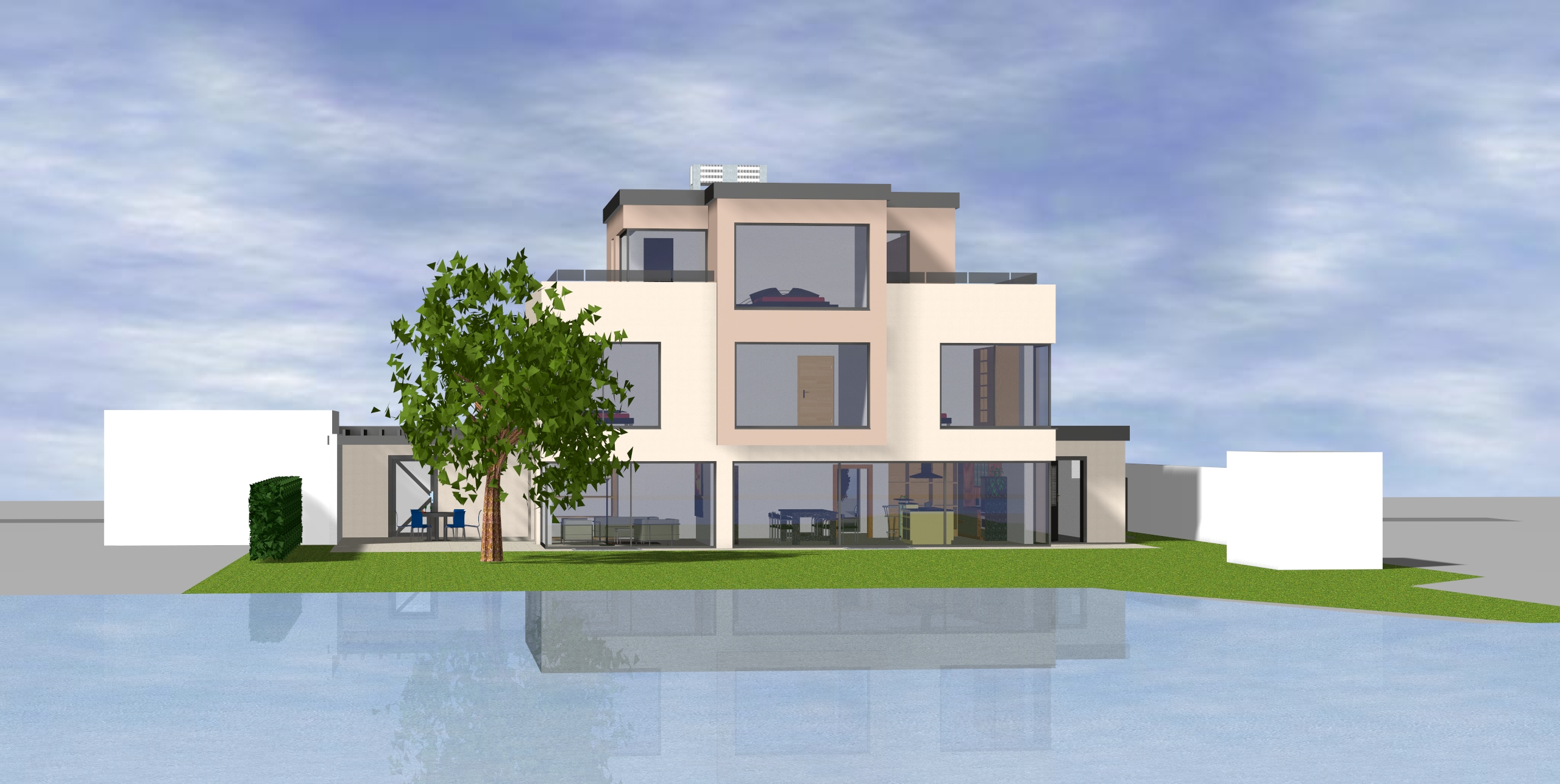 genau dieses rendering berarbeiten fotorealistisches foto exakt dieselbe perspektive und kameraposition wie das hochgeladene referenzbild 100 identische geometrie exakt gleiche anordnung exakt identische fensterpositionen mit gleichem ausblick durch die fenster weiches nat rliches tageslicht leicht schr g einfallende sonne durch die fenster alle r ume hinter den fenstern k nstlich ausleuchten sanfte realistische schatten realistische materialien echte texturen hochwertige oberfl chenreflexionen echte menschen echte autos pflanzen mit echten b umen und str uchern ersetzen gr ne fl chen mit wiese rasen und einigen b schen ersetzen sehr realistische umgebung belebte szene mit menschen und autos gr sse der erwachsenen menschen etwa 1 80 meter und proportional zum haus nat rlicher himmel mit leichter bew lkung nat rliche farbwiedergabe leicht warme farbstimmung golden hour feeling blickrichtung ist nach norden sonnenlicht kommt von westen f ge subtile atmosph rische effekte hinzu wie leichten staub in der luft oder nat rliche farbvariationen ohne die urspr ngliche szene zu ver ndern das bild muss wie eine professionelle fotografie aussehen es soll ein echtes und reales foto sein canon eos r5 35 mm festbrennweite f 2 8 hyperrealistisch dslr qualit t raw aufnahme 8k aufl sung extrem scharf perfekte tiefensch rfe professionelle architekturfotografie