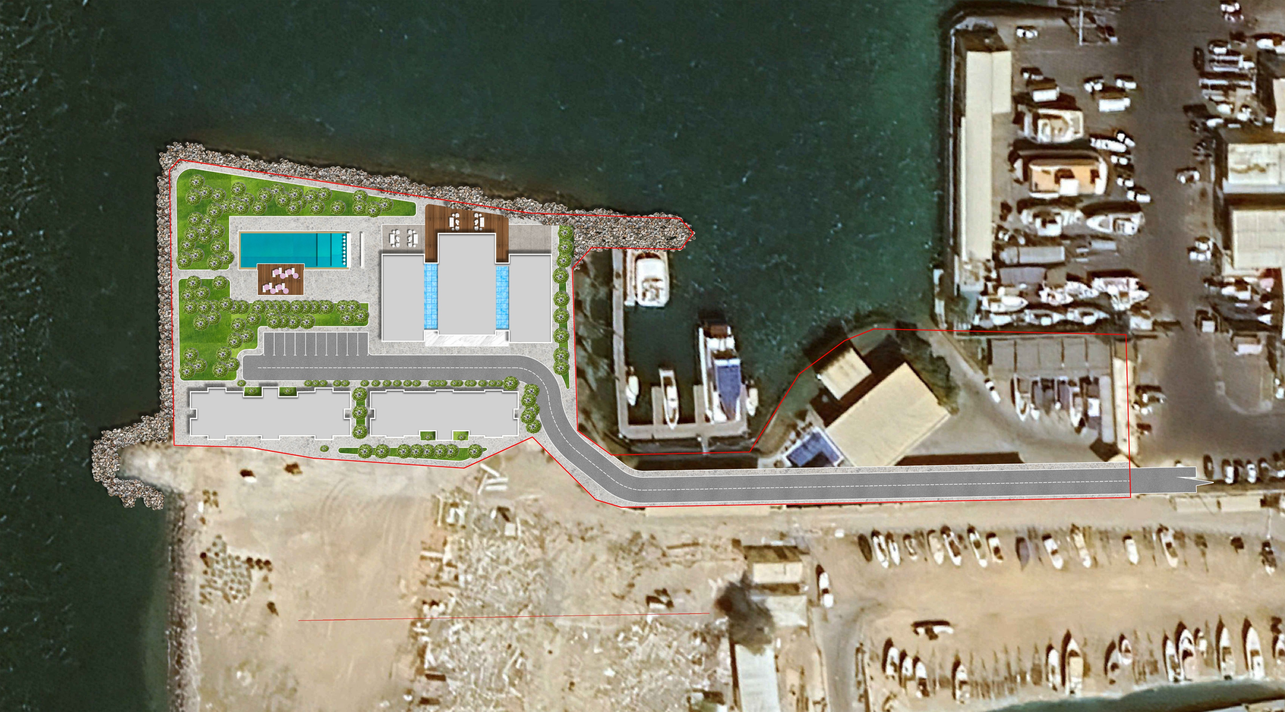 top view for 3 moder building near sea add real effect make it look like real real trees around swimming pool swimming pool with juice bar in short eddg real texture real water color real out door furniture for swiming pool real cars white color for buildings top roof look likr realistic architecture top view main villa has sky light