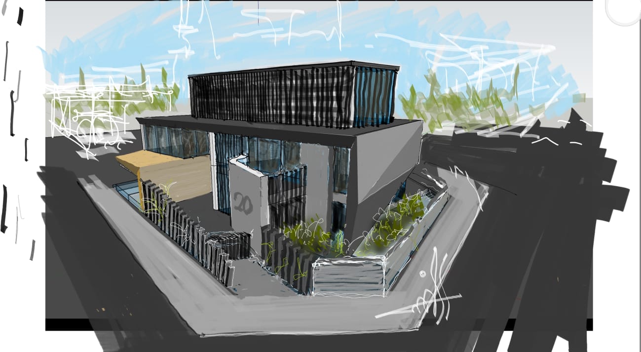 nordic interior from the top keep geometry without change use smoked gry glass add 2 luxury cars under parking shade at the left side the villa has 3 sides road with chamfered road intersections background is the dubai downtown architecture