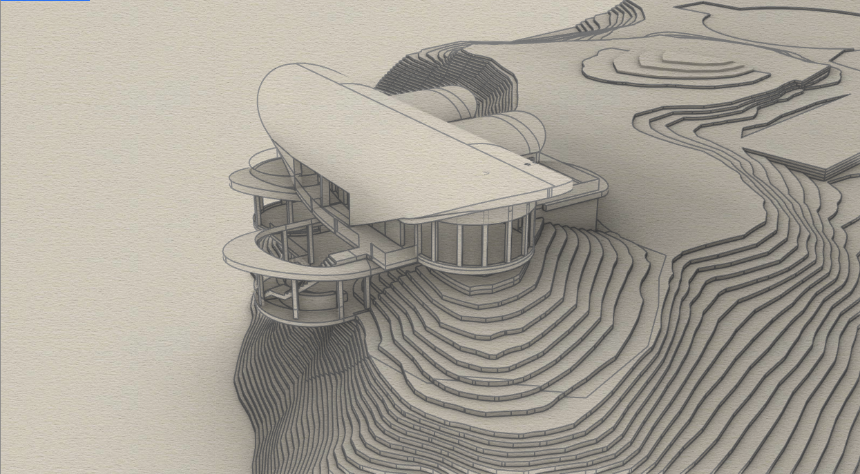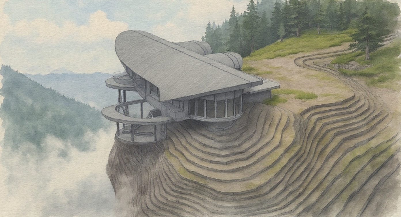 architectural watercolor rendering of the exact building geometry and camera angle shown in mnt data screenshot 2025 11 18 155637 png do not change the building geometry camera position perspective or composition in any way keep all curved roofs platforms supports stairs and proportions exactly as modeled terrain forest requirements soften the blocky stepped terrain under the building into natural rocky mountain slope extend the cliff downward naturally on the left add a dense forest on the right side and in the entire background thick evergreen trees packed closely together like a deep high elevation forest black roof requirements explicit repetitive so the model obeys the roofs must be rendered as black deep dark black not gray not light not washed out specify clearly main roof the large sweeping curved roof covering the upper level must be solid black corrugated metal with visible ribbed texture following the curvature color must stay consistently deep black even in watercolor softness lower curved deck roof the smaller curved roof over the deck must also be solid black metal match the same exact black color as the main roof ribbed corrugated texture visible repeat to ensure compliance both roofs must be rendered in a strong deep black tone not gray not desaturated keep them fully black wall window colors restore original palette exterior walls must be matte gray metal panels with visible seams window frames and mullions must be black steel atmosphere keep the distant hazy blue mountains cloudy bright sky and add subtle fog around the base of the cliff for elevation watercolor style soft architectural watercolor rendering with pencil ink linework delicate washes and gentle paper edge fading while preserving all geometry exactly