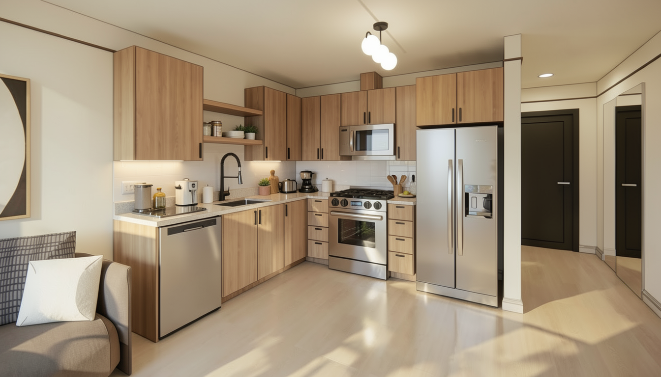 place in snowy mountains add more trees around cabin make garage doors dark grey