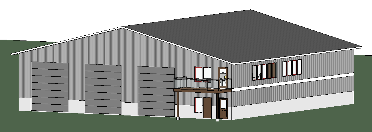 make look realistic use natural lighting make day time add landscaping with plants shrubs flowers and surrounding trees make the roof have large metal panels the siding on the building is dark grey metal vertical panels add a large driveway to all three garage doors coming straight from the left side no rock on the building