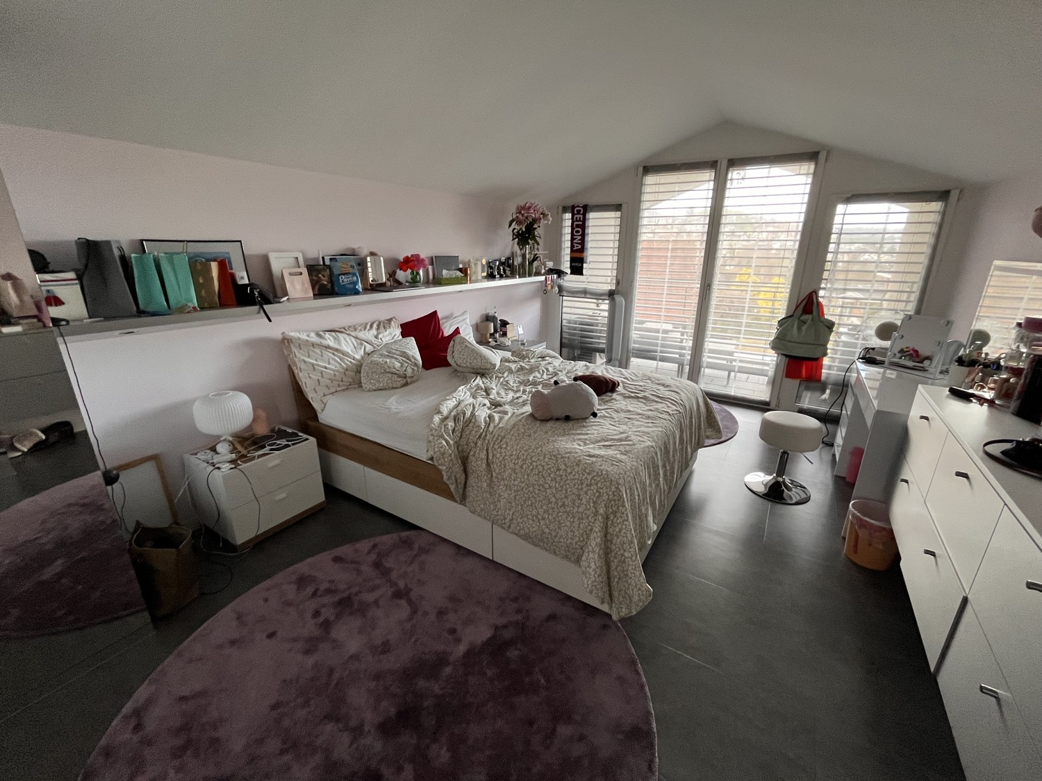 genau dieses rendering berarbeiten fotorealistisches innenraum foto exakt dieselbe perspektive und kameraposition wie das hochgeladene referenzbild 100 identische raumgeometrie aus der vogelperspektive raumgeometrie genau beibehalten giebel winkel genau so belassen vier fenster genauso belassen ersetze das bett mit einem designerbett neue vorh nge ber die ganze breite aller fenster mit tag und nachtvorh ngen beige w nde boden riemenparkett eiche braun designerteppich grosses neonlicht herz in rot alles aufr umen minimalistisch h ngendes b cherregal links und rechts vom bett mit licht nach oben leuchtend b cher und assesoires beleuchtung unter dem bett rechte seite korpus weiss mit unterbaulicht schminkbereich mit beleuchtetem spiegel puff davor weisse runde spots in giebeldecke weiblicher teenager mit s damerikanischem aussehen auf dem bett am lesen vollfl chige horizontale jalousien ausserhalb der fenster raum zus tzlich k nstlich ausleuchten mit weissen runden deckenspots sanfte realistische schatten weiches nat rliches tageslicht mit schatten der jalousien an den w nden hochwertige oberfl chenreflexionen nat rliche farbwiedergabe golden hour feeling hell ausleuchten das bild muss wie eine professionelle fotografie aussehen es soll ein echtes und reales foto sein canon eos r5 35 mm festbrennweite f 2 8 hyperrealistisch dslr qualit t raw aufnahme 8k aufl sung extrem scharf perfekte tiefensch rfe professionelle architekturfotografie aus der vogelperspektive