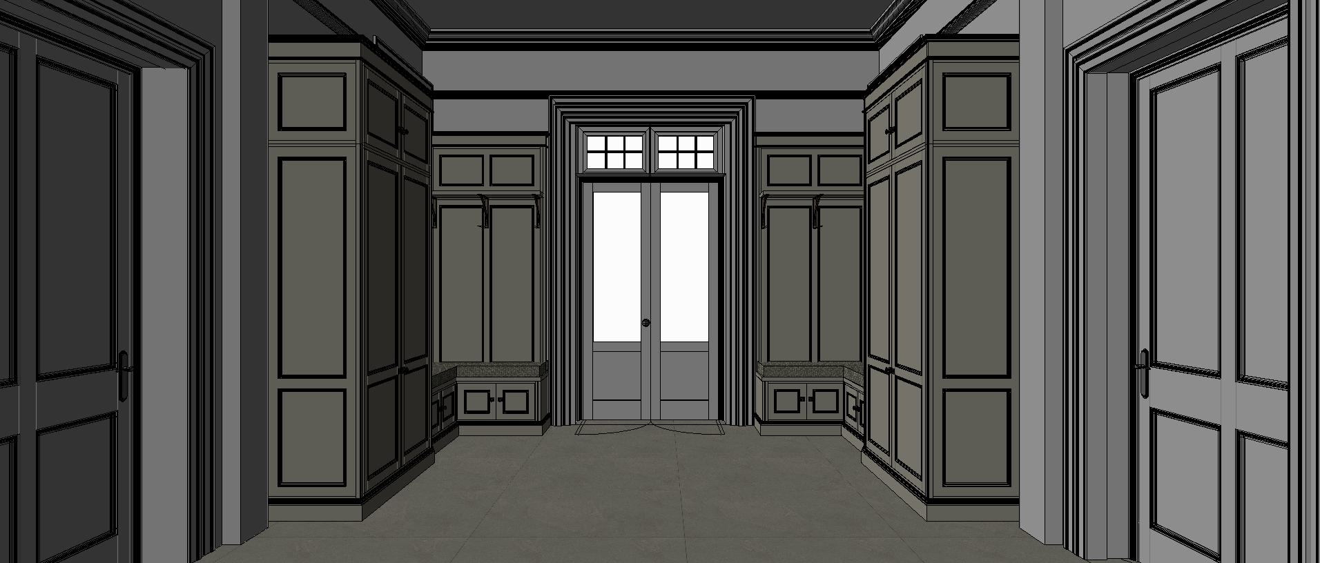 render this into a beautiful hallway and bootroom walls ceilings and room doors painted in benjamin moore october mist floor in old honed cream antique marble all mouldings to be as is view from window hazy blue sky and fall trees out of focus hardware in antique bronze add accessories to suit like a showroom do not change any furniture