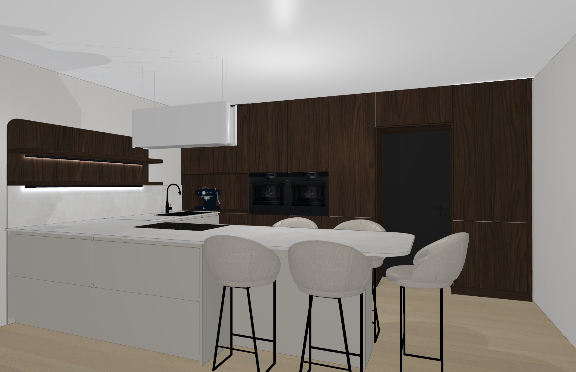 render a modern kitchen with a minimalist design featuring a sleek white and light gray color palette for the cabinets and countertops incorporate rich dark brown wood for the cabinet walls adding warmth and sophistication use soft beige for the barstools to complement the overall aesthetic add a matte black sink faucet and modern kitchen appliances for a chic contemporary look set the atmosphere with soft ambient lighting to create a cozy and inviting space highlighting the textures and contrasting colors