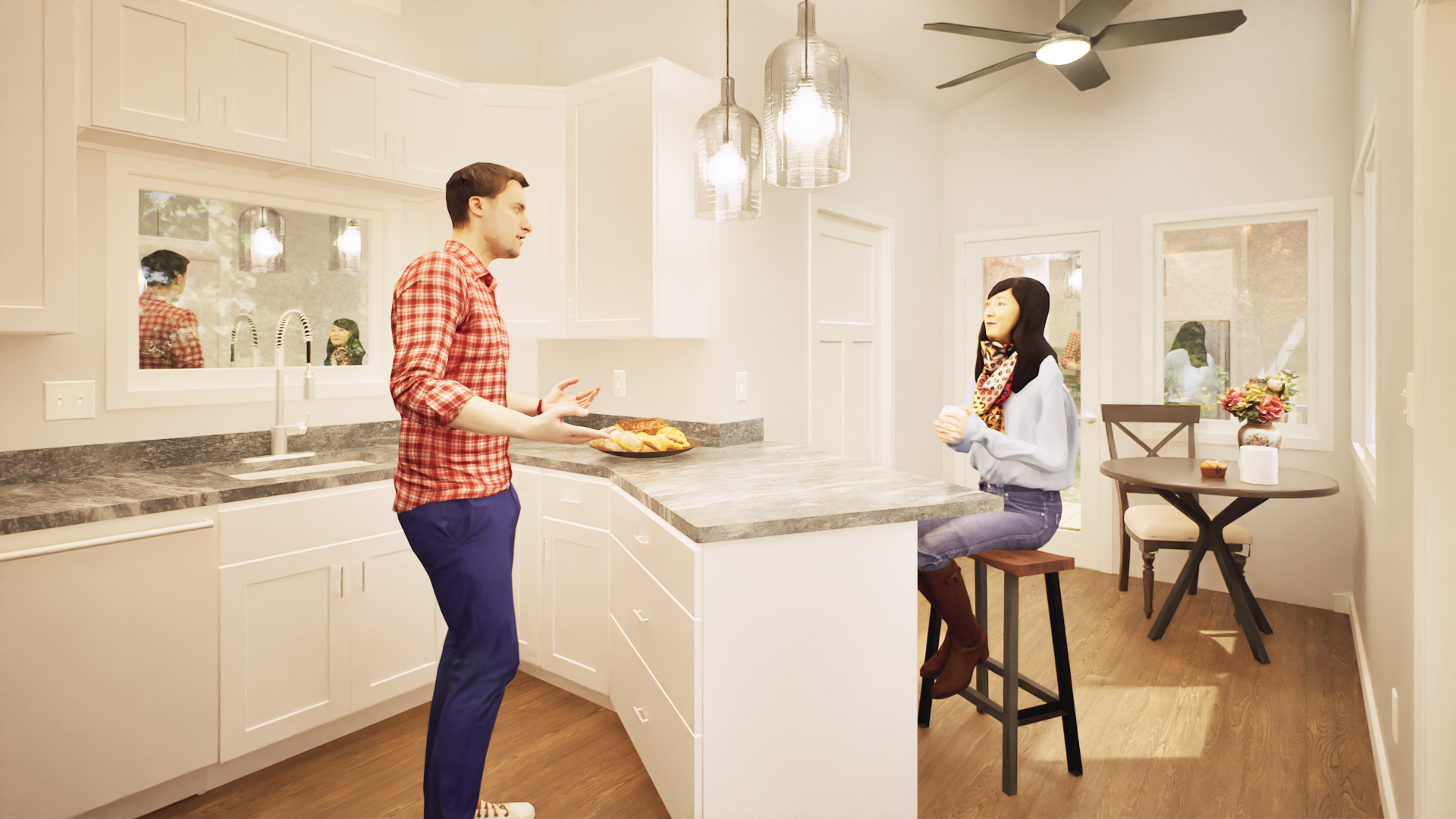 photorealistic interior architectural photography warm natural daylight under cabinet lighting and illuminated can lights in the ceiling soft directional light with realistic shadow falloff and gentle contrast bright but warm atmosphere realistic global illumination with subtle ambient occlusion in corners and at material transitions dslr with a 35mm lens eye level perspective professional architectural composition and framing and realistic depth slight depth of field foreground and midground in focus background softly flailing off physically based materials throughout with enhanced texture detail natural surface variation and subtle imperfections with realistic sheen high quality windows with realistic thickness subtle reflections of the interior soft exterior reflections and accurate light transmission windows feel transparent exterior visible through windows feels real and grounded with natural daylight realistic trees and landscape interacting with the light warm color temperature balanced with natural daylight soft highlights realistic shadows gentle contrast subtle camera noise natural exposure not overly sharp soften corners and edges professional photography style remove the people from the image