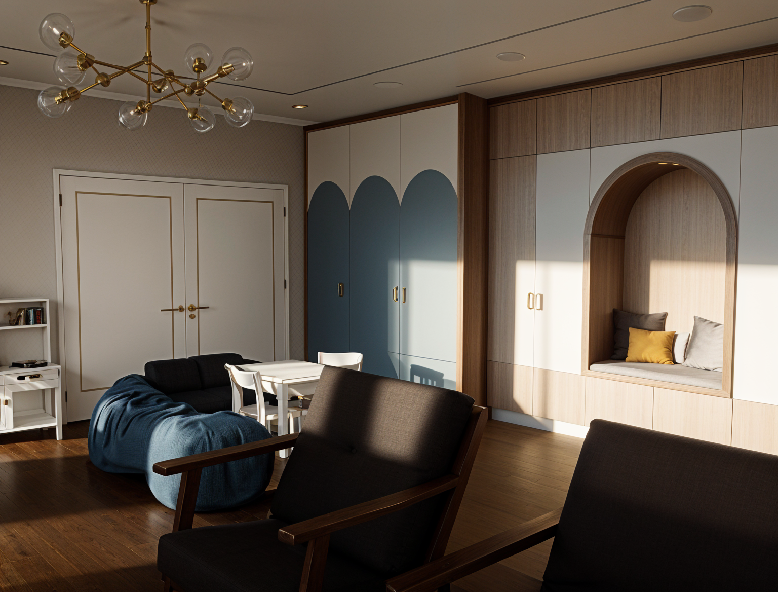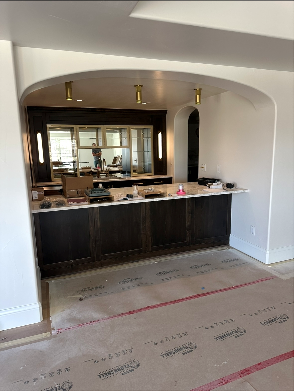remove the metal doors on the back wall add an arch with floating shelves in this area