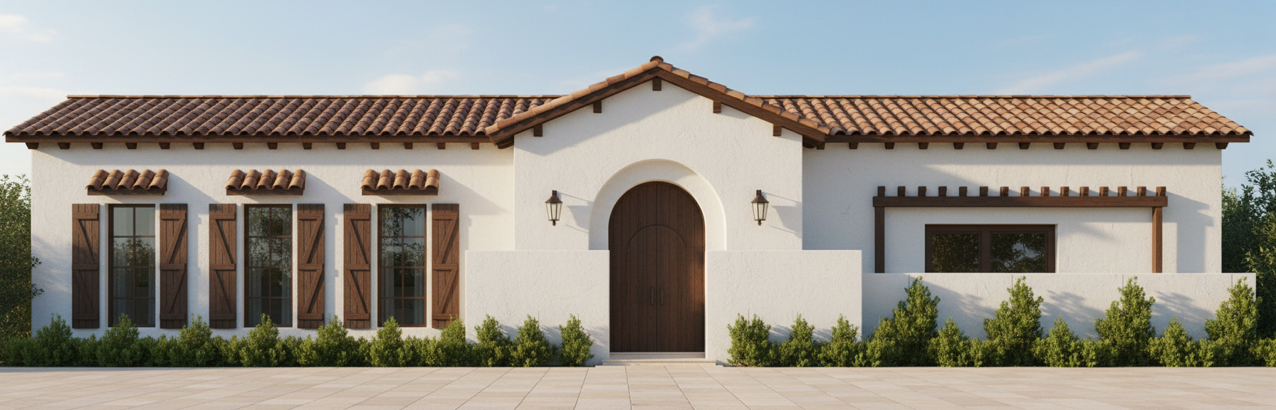 render a transitional modern home creamy white cut stone dark windows dark brown roof over cast day spa resort pool lots of landscape and lots of trees