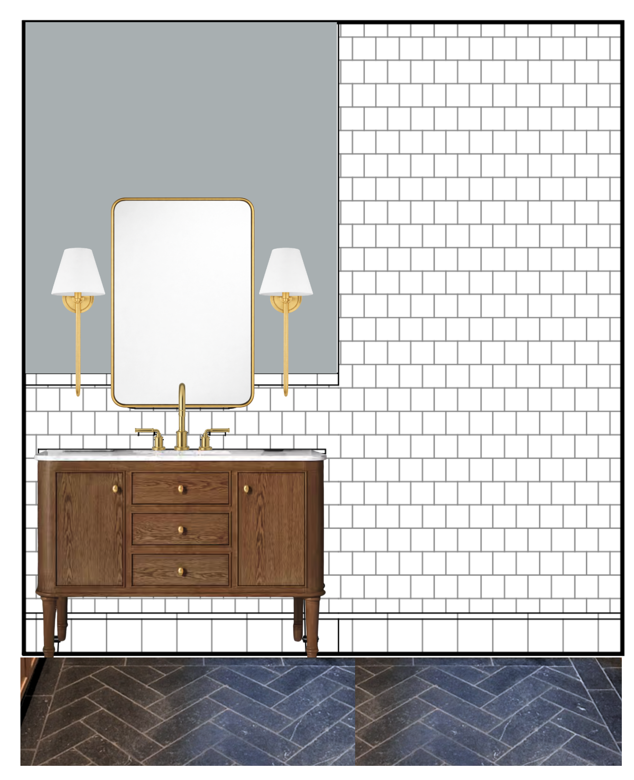 where the field of tile is on the right is the side view of a small curbless shower with frameless glass and brass fixtures