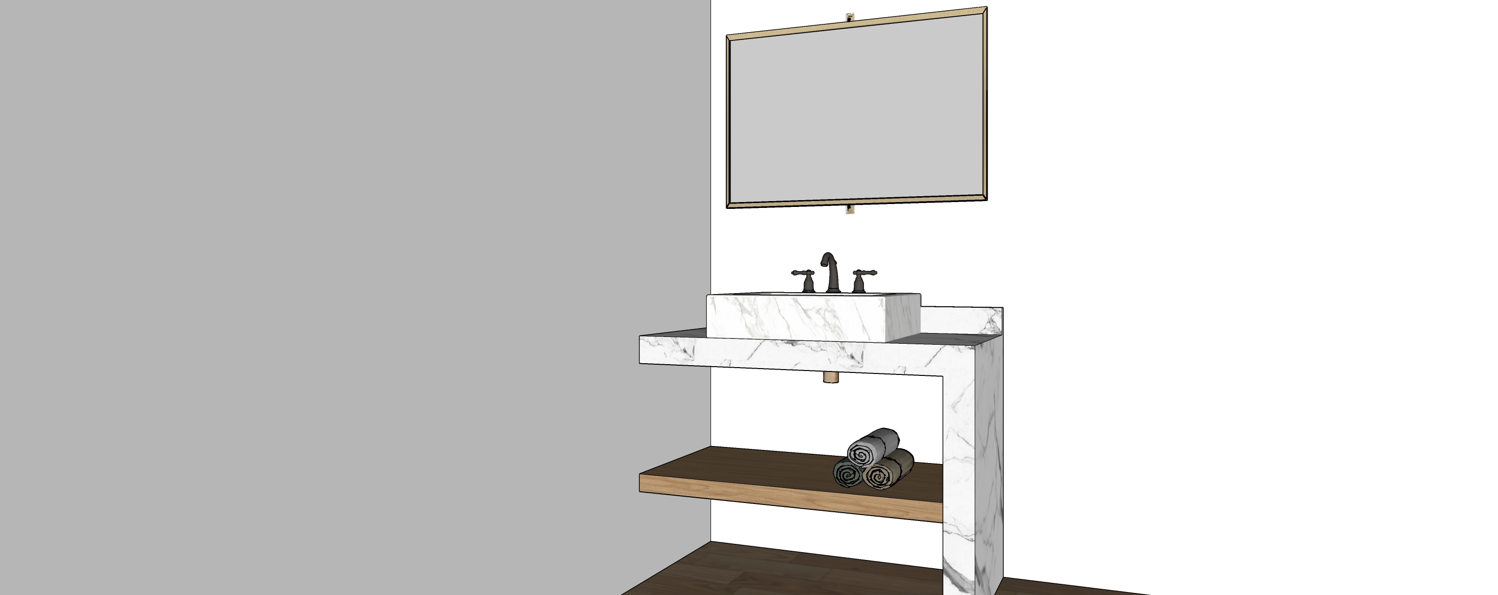 exterior shot render a luxurious bathroom corner featuring a sleek marble sink with subtle gray veining complemented by a polished chrome faucet the wall is a soft dove gray with a large frameless mirror reflecting ambient warm light a wooden shelf below in rich walnut finish holds neatly rolled towels in shades of white and soft beige the atmosphere is calm and inviting with a minimalist and modern design style