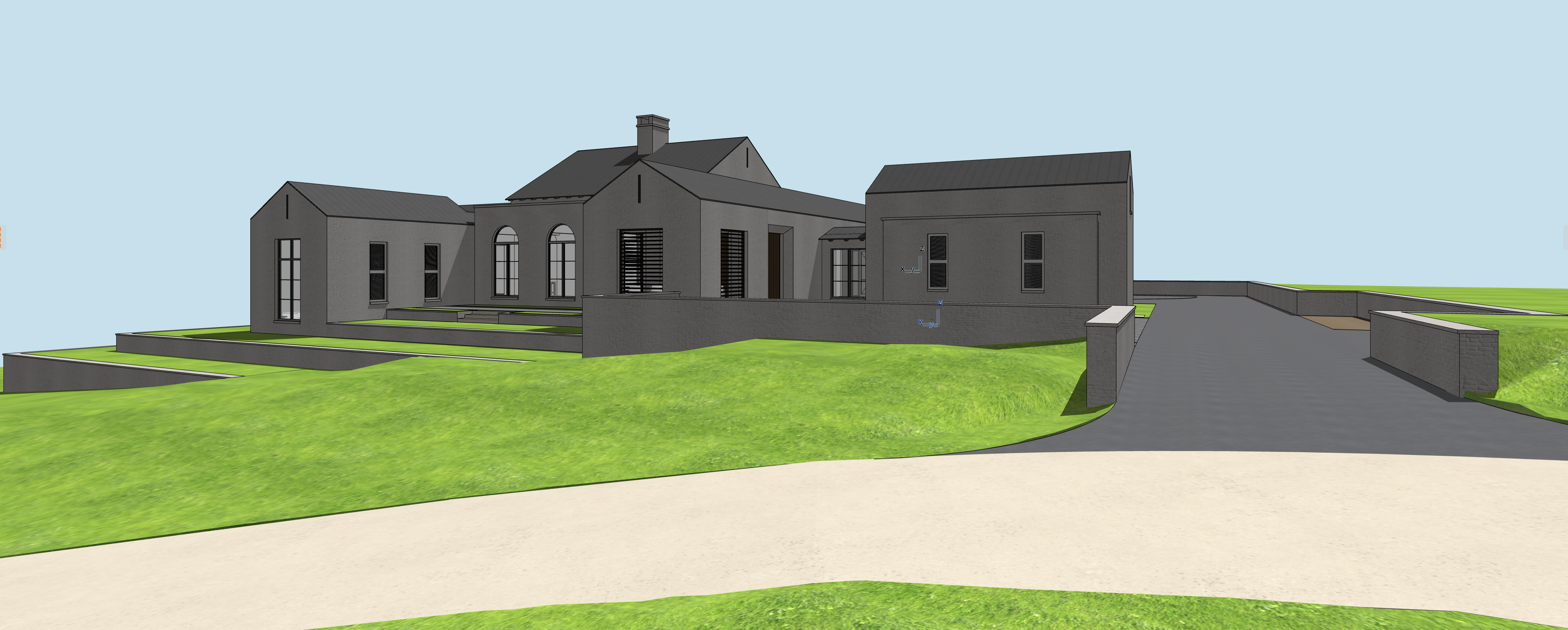 white lime washed brick manicured grass in the foreground grey standing seam roof trees in the background