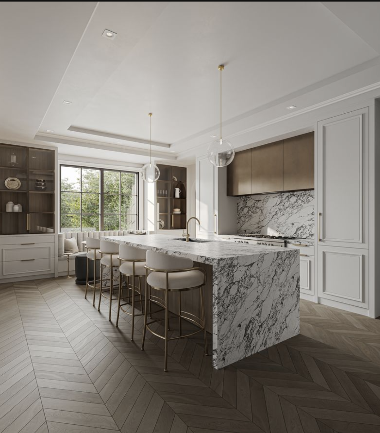 interior shot create a modern elegant kitchen interior with a luxurious atmosphere the spacious room features a large island with a white marble countertop with grey veining the cabinetry is a soft light grey with gold accents the bar stools are upholstered in beige fabric with gold frames the floor is a chic herringbone pattern in light brown wood large windows allow natural light to flood in highlighting the greenery outside the lighting is provided by two pendant lights with clear glass and gold fixtures the overall color palette includes light grey white beige gold and natural wood tones creating a serene and sophisticated ambiance