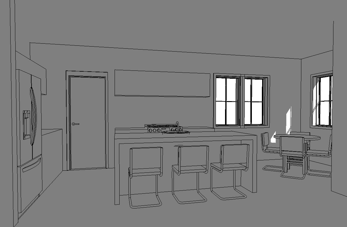 classical interior shot a modern kitchen with an inviting atmosphere featuring warm off white cabinets and black countertops the walls are a soft warm beige creating a cozy ambiance reflect the natural light pouring through large clear glass windows the central island has elegant high back chairs with dark wooden frames and ivory cushions the round dining table in the corner is adorned with a simple elegant vase of fresh flowers soft sunlight casts gentle shadows enhancing the serene and welcoming feel of the space architecture