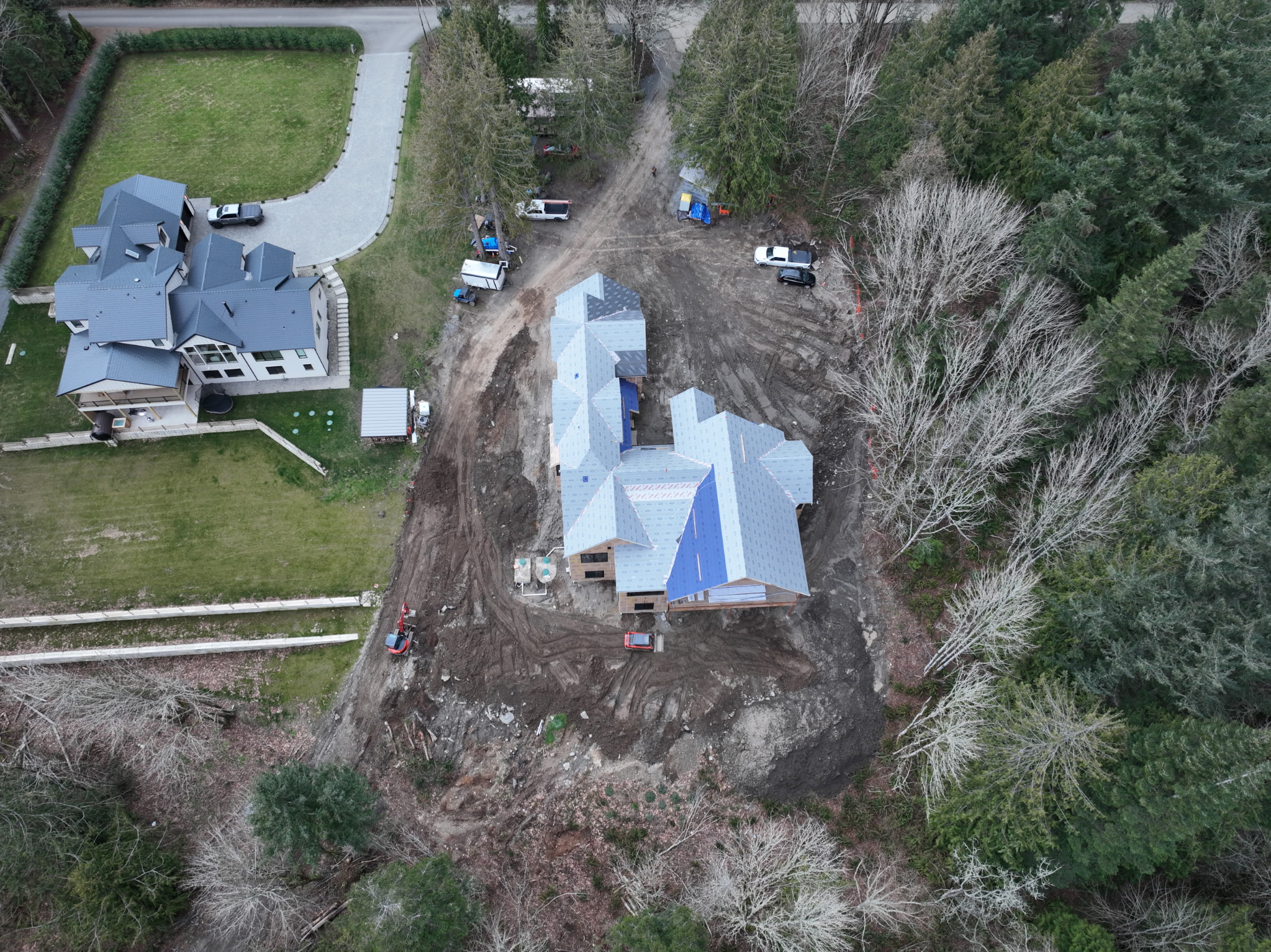 driveway and parking area at the front and a paved road along the side of the house leading to the back house is on a slope so add retaining walls in the back yard