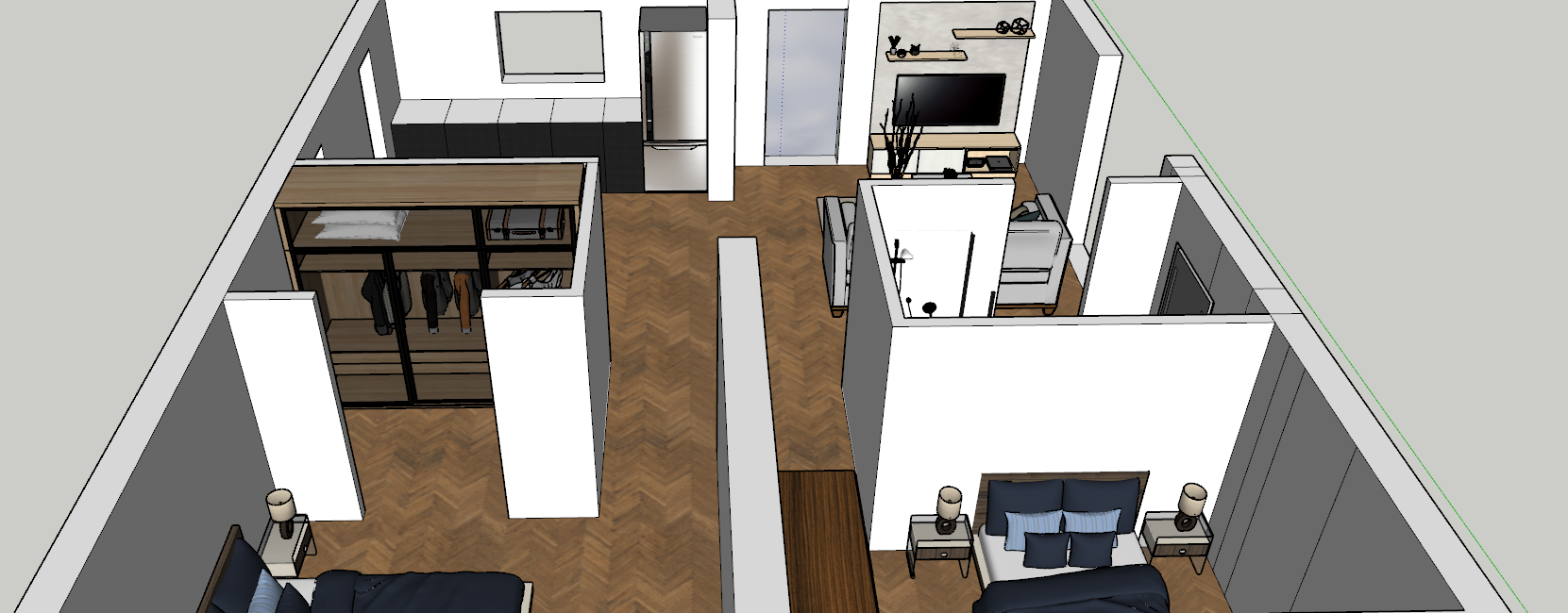 internal 2 bedroom layout with a walki in wardrobe in one room bathroom and kitchen as in the photo make realistic aerial view