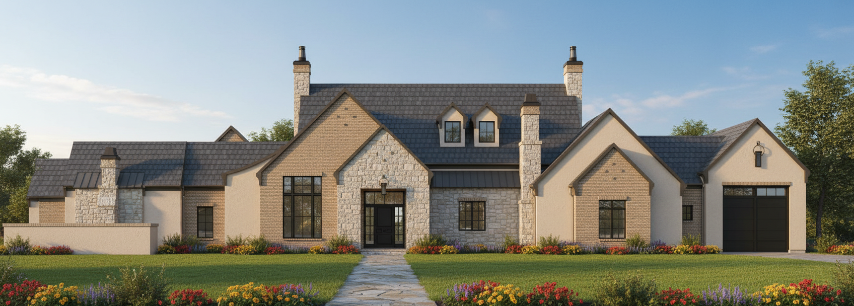 do not change the materials of the building and do not change the design of the building enhance the stone material and enhance the charcoal grey corrugated metal panels do not change the parking and road do not change the curb design this is a commercial building do not change the charcoal grey color of the building add a light sky do not show grass on the road