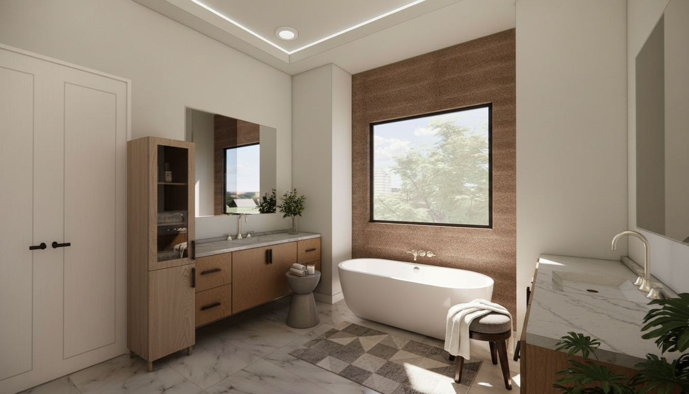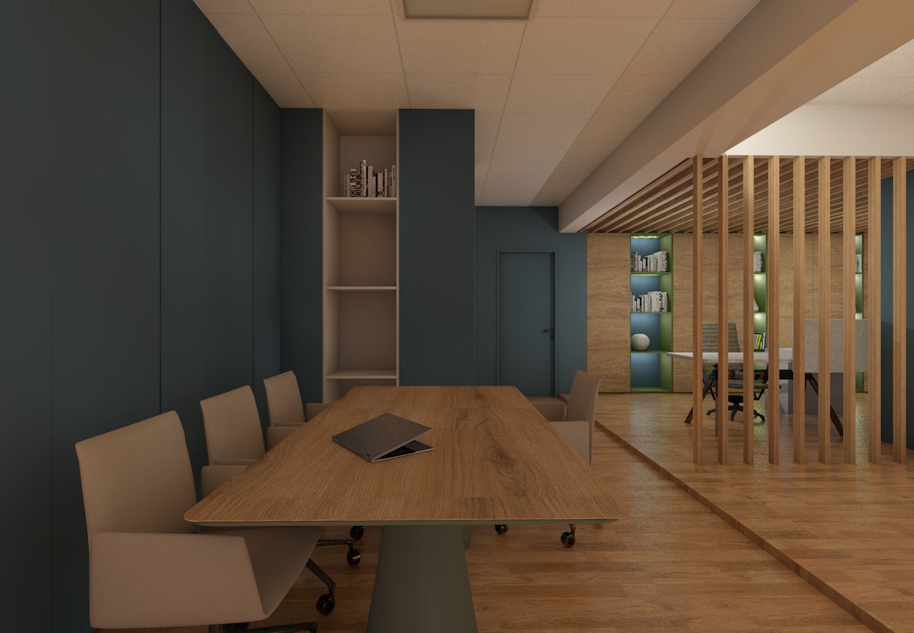 create a high quality realistic render of a modern executive office with a calm professional and prestigious atmosphere the space features warm wooden flooring throughout combined with soft beige and neutral wall tones the main executive desk is placed on a slightly elevated wooden platform reinforcing hierarchy and authority invinting dusty blue keep the initial design