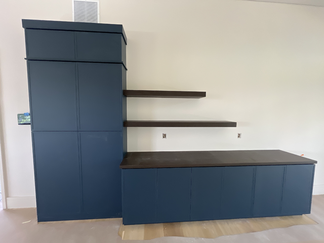 do not change the cabinets in any way preserve the exact cabinet colors materials finishes dimensions door and drawer styles hardware spacing alignment and all geometry exactly as shown do not alter the countertop shape backsplash appliances flooring lighting fixtures or wall structure only remove the construction materials clutter and mess from the scene clean the room and make it look finished and staged add a few simple tasteful home accessories appropriate for the style of the space but do not add or remove any furniture windows or architectural elements maintain the original lighting direction and realism enhance clarity and polish the photo while keeping the cabinetry and room design completely unchanged do not alter the lighting to keep the cabinet colors as they are in the image stage this as a game room and remove the vent on the top wall and add new flooring