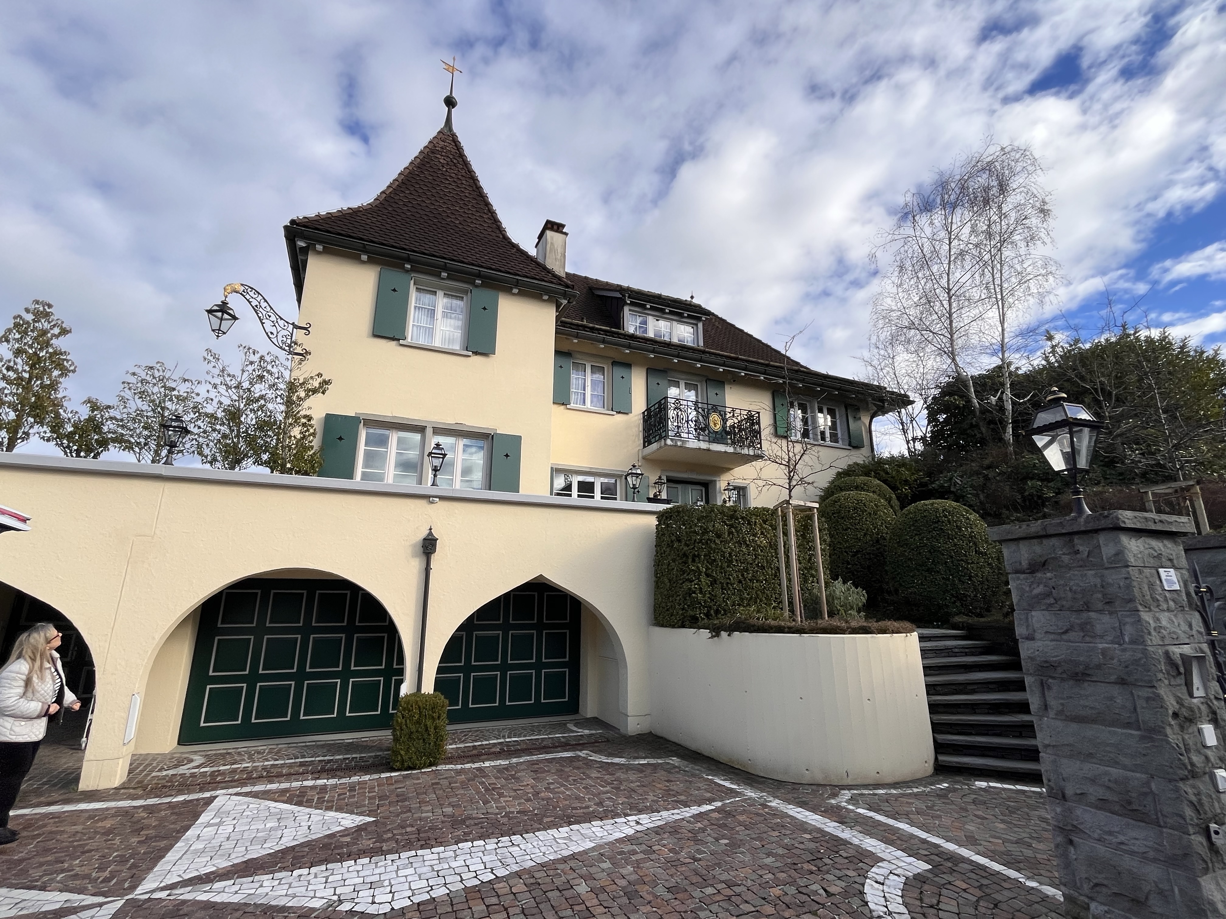 genau dieses foto berarbeiten haus reinigen so dass es neu aussieht gartenplatten und zufahrt reinigen die beiden rechten arkadenb gen entfernen so dass ein hindernisfreier zugang zur garage entsteht fotorealistisches foto exakt dieselbe perspektive und kameraposition wie das hochgeladene referenzbild 100 identische geometrie exakt gleiche anordnung exakt identische fensterpositionen mit gleichem ausblick durch die fenster weiches nat rliches tageslicht leicht schr g einfallende sonne durch die fenster alle r ume hinter den fenstern k nstlich ausleuchten sanfte realistische schatten realistische materialien echte texturen hochwertige oberfl chenreflexionen blickrichtung ist nach norden sonnenlicht kommt von westen echte menschen echte autos pflanzen mit echten b umen und str uchern ersetzen sehr realistische umgebung belebte szene mit menschen nat rlicher himmel mit leichter bew lkung nat rliche farbwiedergabe leicht warme farbstimmung golden hour feeling das bild muss wie eine professionelle fotografie aussehen es soll ein echtes und reales foto sein canon eos r5 35 mm festbrennweite f 2 8 hyperrealistisch dslr qualit t raw aufnahme 8k aufl sung extrem scharf perfekte tiefensch rfe professionelle architekturfotografie