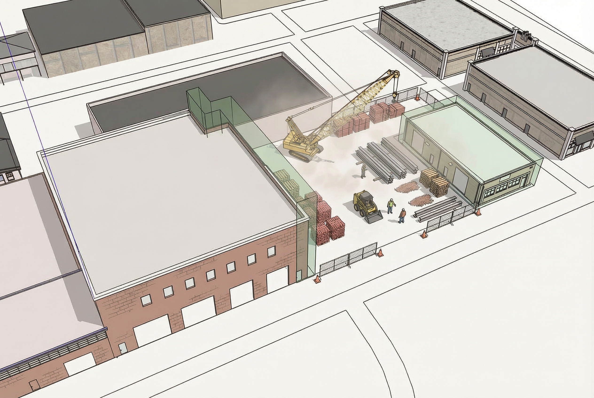 maintain this exact image geometry camera and architectural illustration style do not change or distort the green translucent massing volumes add slightly deeper soft diagram style shadows under equipment fencing materials workers and along building edges keep them subtle and desaturated not photoreal increase the size and quantity of ground level brick stacks steel bundles and material piles so the site looks more actively staged but keep them organized and cleanly illustrated preserve the pastel tone and drawn aesthetic avoid realistic textures heavy dust or dramatic lighting