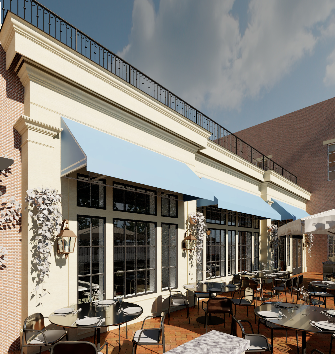 strict maintain exact building geometry massing proportions openings materials layout and camera perspective from the input revit model do not alter structure roofline window door locations patio layout or site walls project adaptive reuse of historic firehouse longworth s fire company no 15 in mount adams cincinnati ohio preserve entire existing structure including original firehouse and rear addition material intent all primary wall surfaces are existing red brick matching the reference photo aged cincinnati brick varied tone subtle weathering cream tan elements are painted exterior trim only window surrounds cornice banding not stucco or eifs no new wall materials introducedcontext match reference image closely sloped mount adams street condition with slight uphill grade brick paver sidewalk at building frontage low stone retaining wall with iron railing above mature street trees partially obscuring fa ade important adjacent buildings tight to sides urban hillside fabric black street lamps subtle historic character parallel street parkingsite patio maintain raised patio condition exactly as modeled black metal railing at patio edge outdoor dining with neutral umbrellas and simple furniture clean but slightly lived in not staged or perfect architecture details preserve historic firehouse fa ade proportions and detailing signage integrated cleanly no oversized or fake signage large storefront glazing at ground level with realistic reflections upper windows maintain original proportions and trimlighting early evening golden hour warm interior lighting visible through windows soft exterior accent lighting on brick and signage natural shadows consistent with street treesatmosphere photorealistic grounded true to life cincinnati urban hillside environment slight depth haze no stylization no exaggerated effectsdo not do not suburbanize the setting do not add parking lots or open space do not change materials do not clean up or modernize surrounding buildings excessivelycritical preserve all awnings exactly as modeled in geometry size projection and placement awnings are high end fabric canvas in a deep navy midnight blue tone almost black in low light matte finish with very subtle texture no gloss fabric is clean and tightly stretched with minimal sag crisp edges and refined proportions color should remain consistent across all awnings lighting creates soft natural gradients across the fabric surface with slight warmth from nearby lighting do not change awning shape remove them or alter their alignment add curated restaurant patio landscaping inspired by upscale european style outdoor dining incorporate a mix of planters medium and large round planters in neutral tones light stone terracotta off white ceramic dense green shrubs and small ornamental plants with natural variation climbing vines trained vertically along wall surfaces between windows subtle not overgrown planter placement along patio edges near railing between window bays to soften fa ade rhythm near entry points and corners for layeringvegetation style lush but controlled well maintained not wild mix of leafy greens with varied sizes and textures slight natural asymmetry for realismdo not block major architectural elements or signage maintain clear circulation paths