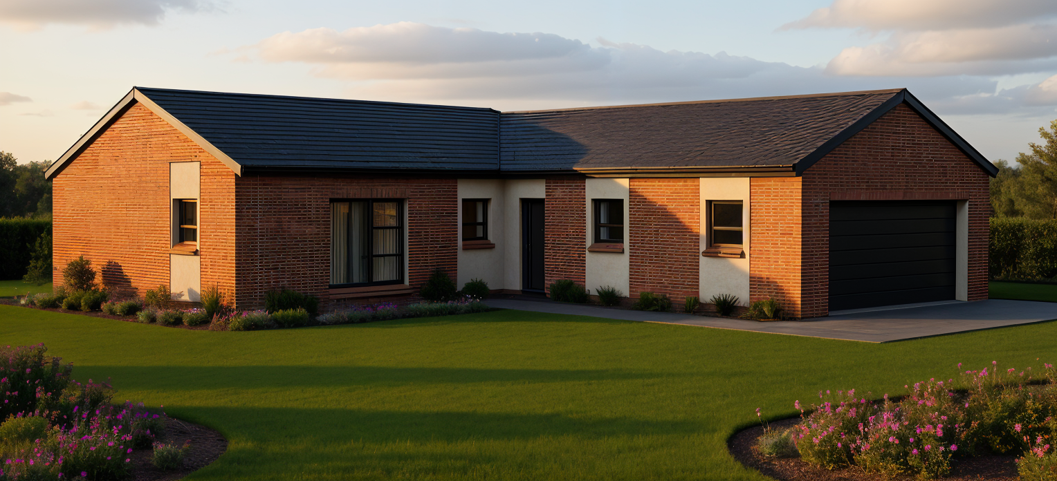 a manicured lawn layered flower beds low maintenance shrubs native plants bright sun shining on the house with some clouds in the sky and some interior lights on add exterior lighting