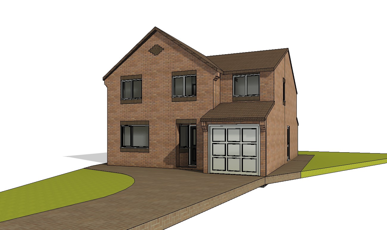 create a photorealistic render of the house within a suburban housing estate with light tree coverage to the rear no houses to the reat