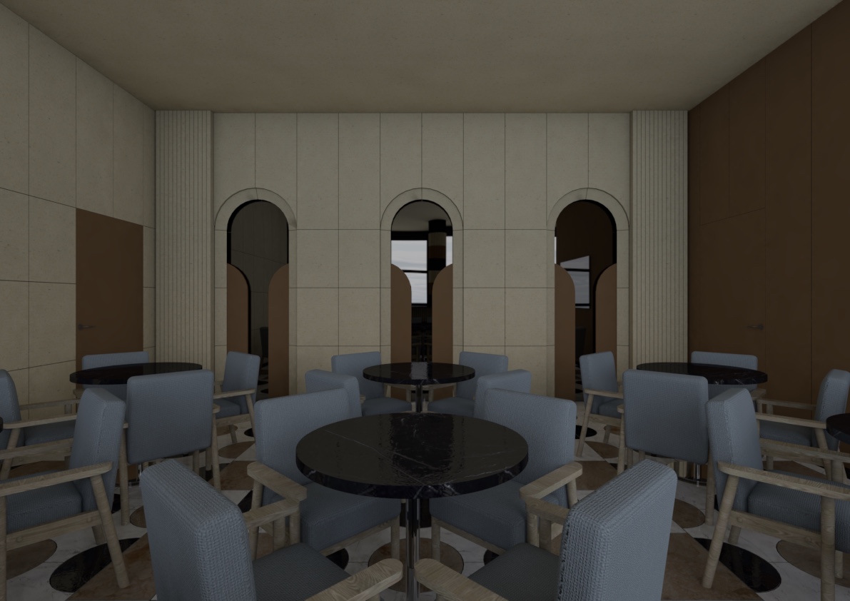 preserve exactly the existing camera position framing perspective scale proportions geometry textures colors and functions of all architectural and furniture elements do not move resize redesign remove or replace any walls niches panels arches tables chairs ceiling surfaces or floor elements only enhance material realism texture fidelity lighting quality and atmosphere to achieve a more refined warm and elegant interior rendering lighting additions 1 ceiling contour lighting add concealed warm led strip lighting strictly along the perimeter contour of the ceiling the led must be hidden in a narrow shadow gap where the ceiling meets the wall it must create soft indirect warm light 2700k washing gently down the walls no other alterations to the ceiling geometry or surfaces are allowed no recessed fixtures no spotlights no additional ceiling modifications 2 vaulted niche lighting add concealed warm led strip lighting integrated along the inner contour of each vaulted niche the led source must be invisible only softly outlining the arch curvature decorative light fixtures all fixtures must follow these design rules style refined mid century inspired but clean and contemporary not antiquated materials predominantly polished chrome with secondary frosted glass elements appearance minimal elegant and balanced with the architecture 3 wall lamps place one wall lamp exactly centered between the left niche and the center niche place one wall lamp exactly centered between the right niche and the center niche these lamps must be installed only on the wall that the camera faces no other wall lamps anywhere in the room 4 table lamps place one table lamp precisely at the center of every visible table lamps must sit proportionally and not obstruct the view of the interior 5 pendant ceiling lamps add one pendant ceiling lamp aligned with the vertical axis of each vaulted niche the pendants should hang centrally in front of the niches and be visually balanced with the architecture lighting restrictions strictly prohibit spotlights recessed downlights track lighting additional wall lamps additional ceiling fixtures any change to furniture or architecture atmosphere render a warm sophisticated caf lounge atmosphere with soft indirect illumination subtle chrome reflections gentle highlights on the wall panels and arches balanced exposure and realistic material textures