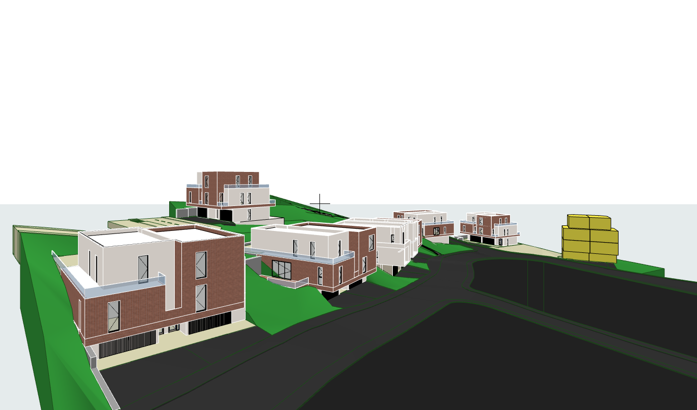 nordic exterior shot modern architectural rendering of a three story house with a contemporary design the exterior features a mix of earthy brick red for the main building blocks contrasted with soft beige tones on secondary structures extensive glass windows in a clear reflective finish enhance the modern aesthetic the balcony railings are sleek transparent glass the roof and garage doors are a subtle industrial gray seamlessly integrating with the clean lines of the design the driveway is a smooth dark asphalt leading to neutral beige sidewalks the surrounding landscape is lush with vibrant green grass sloping gently around the structure the atmosphere is warm and inviting captured in the soft glow of the golden hour with sunlight casting gentle shadows that emphasize the architectural lines architecture