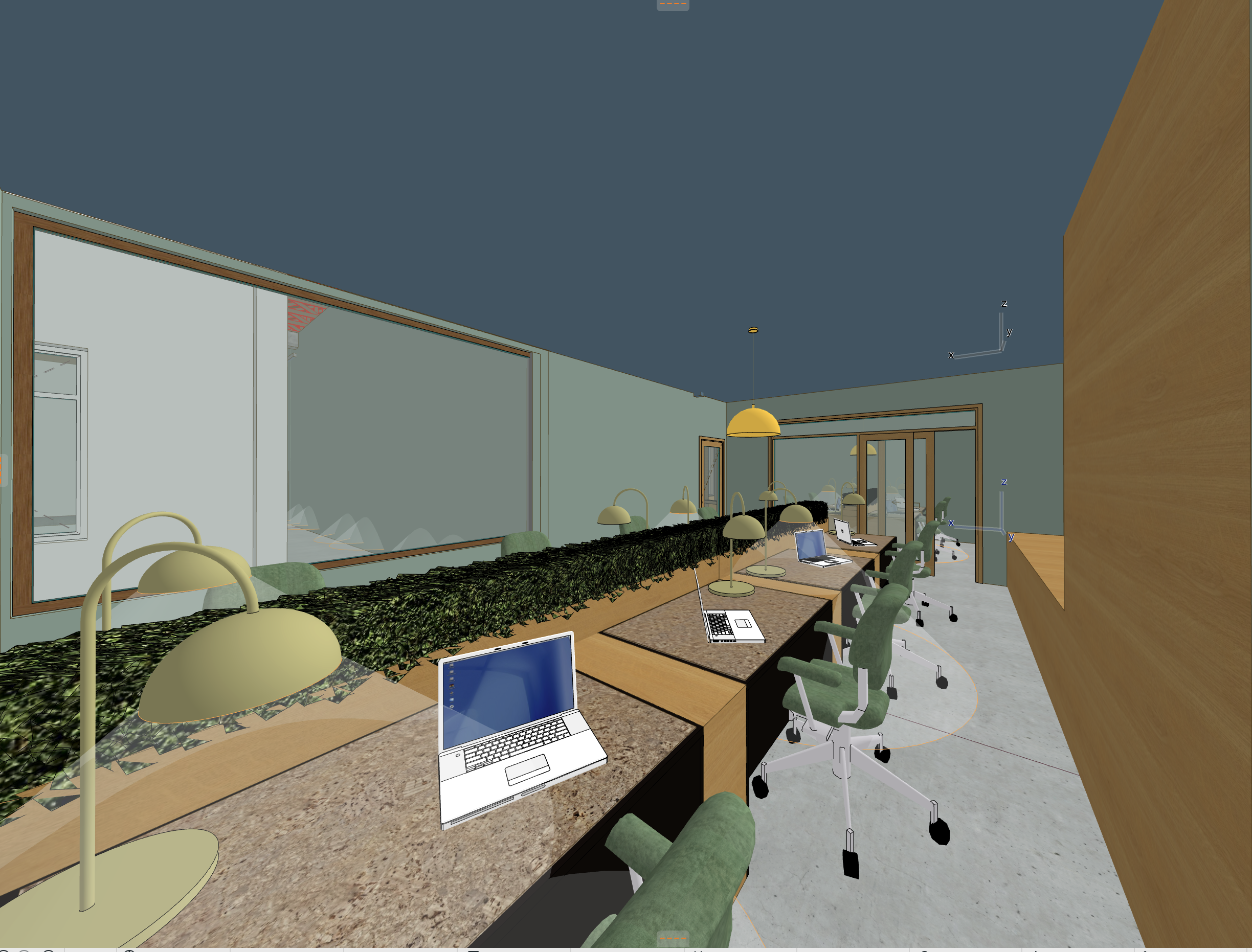 render a beautifully designed modern library workspace with a calm serene atmosphere the ceiling is a soft slate blue wooden walls are a warm oak color adding a natural touch desks are adorned with laptops and soft green chairs for comfort pendant lamps are glowing with a gentle yellow light there are lush deep green plants along the desks the bookshelf has a variety of colorful books the floor is light gray creating a clean minimalist feel the overall color palette is soothing with blues greens and wood tones inviting creativity and focus