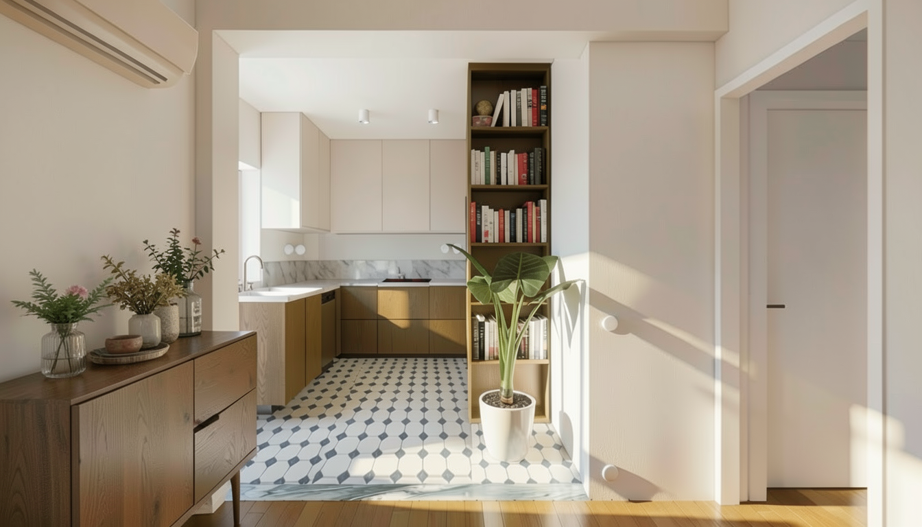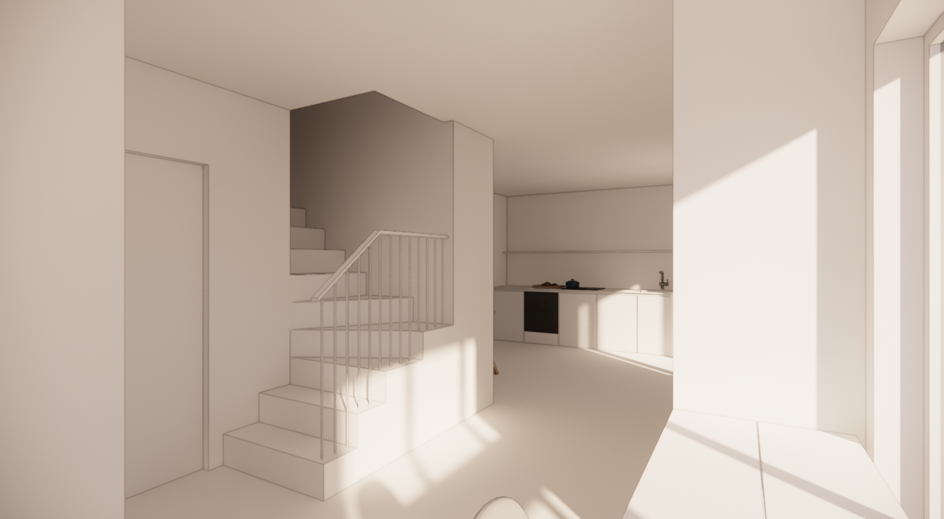 modern cool scandi interior with oak floors man walking up the stairs