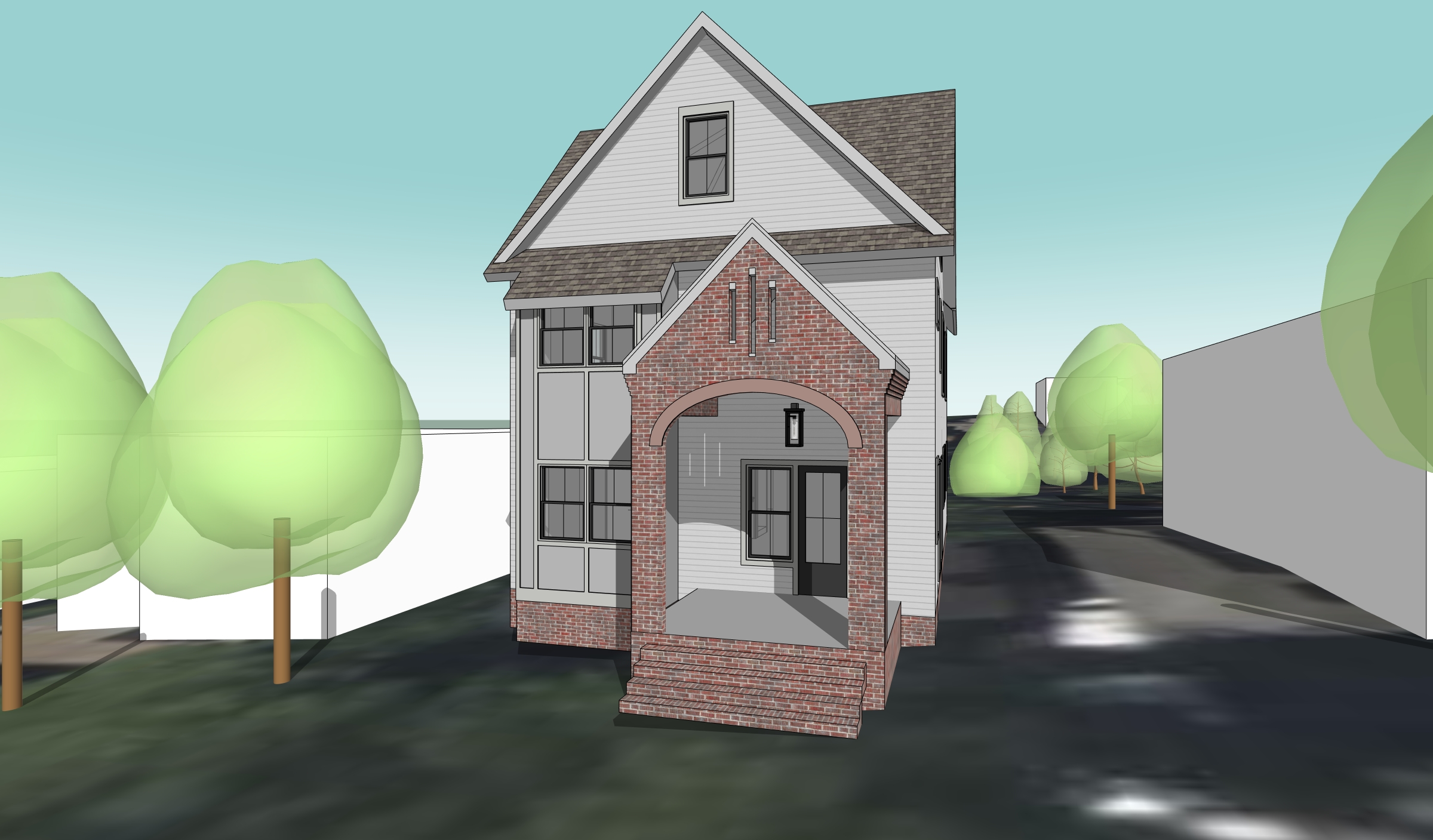 turn the attached sketchup rendering into a photoreal rendering of the house keep geometry massing window placement and details the same high fidelity and representation is important this should be a daylight with slight overcast cloudy afternoon rendering of the house the treat the satellite background image below as the source for context adding detail as appropriate this is an infill site in downtown raleigh and the adjacent white boxes are single story houses with landscaped yards the yard should be landscaped with grass and shrubs with trees beyond