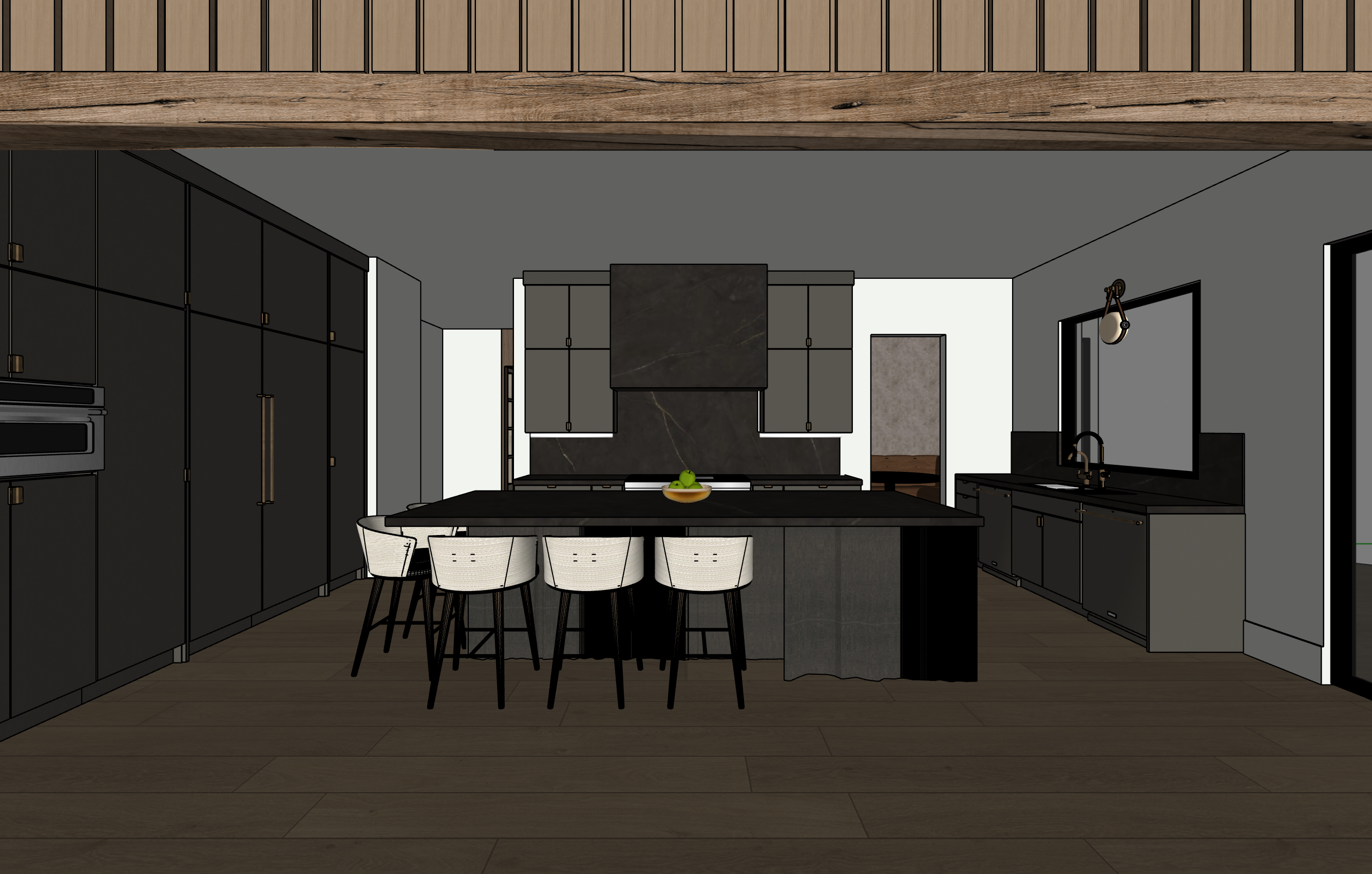 enhance the existing finishes in this contemporary mountain cabin kitchen lighting should be overcast and natural ultra realistic photo like you would see in a design magazine include undercabinet lighting on either sides of the range hood the floor should be a light oak wood plank with light knots and texture