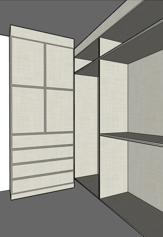 add clothes to the closet hanging rods the material of the built in unit is a light beige linen and gold add handles to the back unit lower the ceiling to the top of the unit