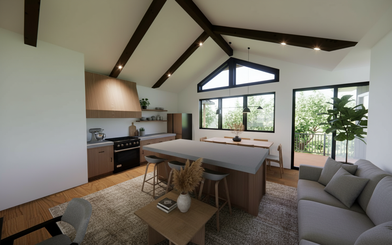 modernist exterior shot watercolor render with tall forest tree background on top of hill architecture