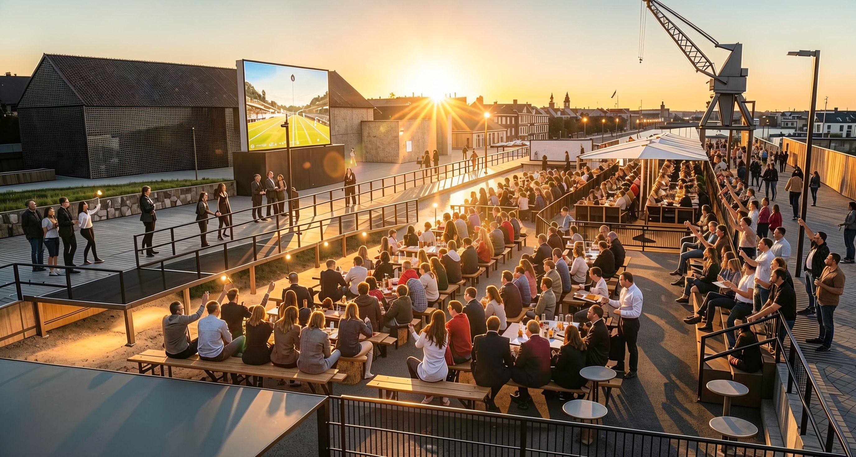 photorealistic premium waterfront event venue at golden hour during sunset large outdoor football screen showing a live match salmar as main sponsor of the event use the official salmar corporate logo only no redesign no stylization no artistic interpretation flat printed logo in correct proportions and typography salmar logos placed on matte black crowd barrier banners on the black fence directly in front of the big screen on the black crowd barriers in the foreground facing the audience logos should feel exclusive clean and professional not oversized not aggressive modern scandinavian harbor setting wooden elements industrial harbor crane visible well dressed adult audience enjoying food drinks and football in a high end outdoor atmosphere cinematic lighting warm sunlight long shadows realistic reflections sponsor branding must feel natural premium and credible integrated as part of the venue ultra realistic materials architectural visualization quality sharp focus high dynamic range 4k realism