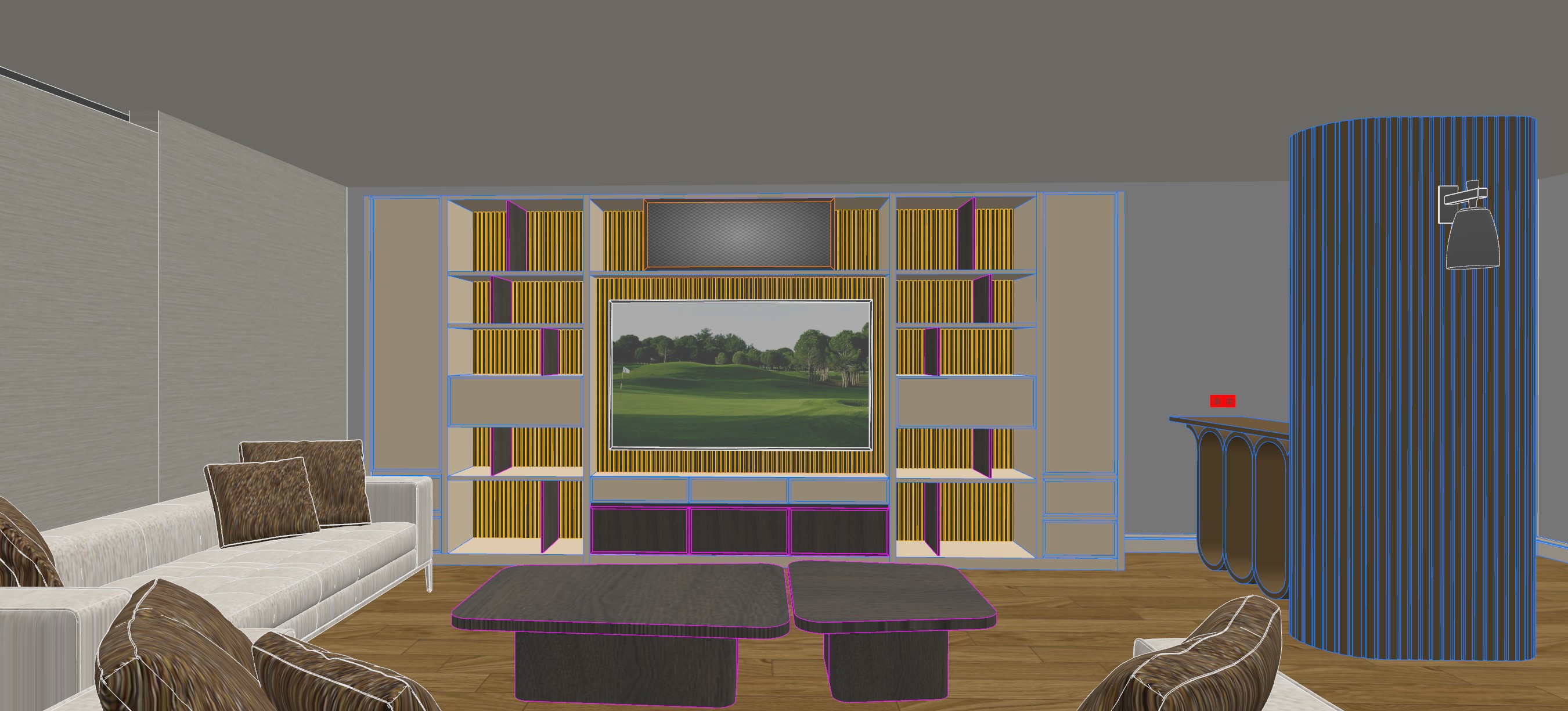 there are 3000 kelvin leds under the open shelves wooden surfaces are walnut veneer the right column cover is mink lacquer color decorate the open shelves put decorations on the central coffee table illuminate from the ceiling with spotlights it should be daylight