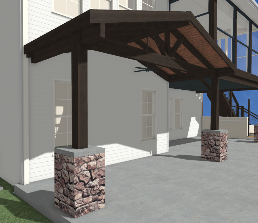 make this more realistic show a table with 8 chairs underneath the roof cap both of the column bases don t add lights