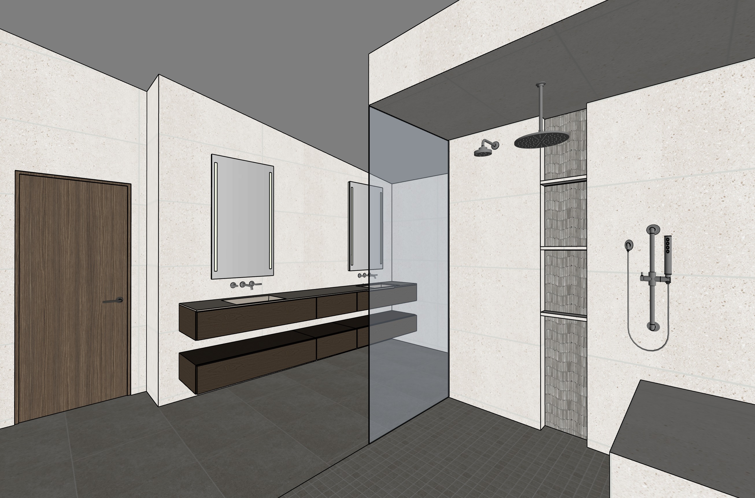 photorealistic enhancement of the provided architectural render preserve the exact architecture layout materials furniture placement and fixtures from the original image with no redesign or modifications the purpose is only to improve realism and lighting quality render as high end interior photography using a full frame camera with a 24 35mm architectural lens balanced exposure realistic dynamic range subtle depth of field and natural color grading the image should look like a professionally photographed luxury interior rather than a computer render soft natural daylight diffused window light global illumination balanced exposure do not change architecture do not change materials no redesign no new objects no additional lights no glowing fixtures no light from shower heads or faucets no dramatic shadows no surreal lighting no warped geometry no stylization the windows looking out to the exterior should be displaying mountains in the distance some trees the plumbing fixtures should have an antique nickel finish the space should not look dark and ominous the room needs to be filled with soft bright light the mirrors should be led mirrors that are both front and back lit there are zero windows in the image and therefore should be zero windows in the end result