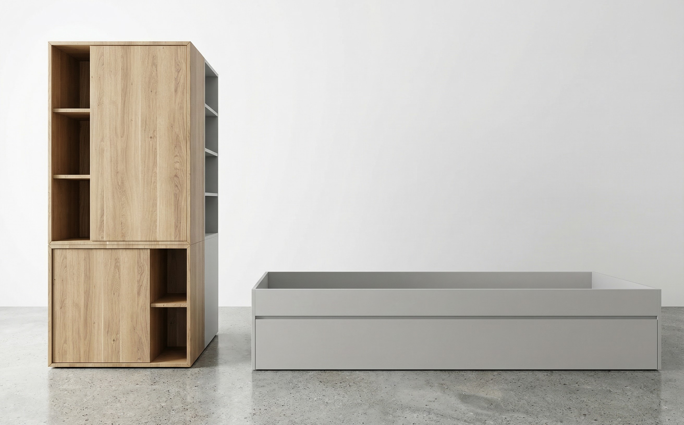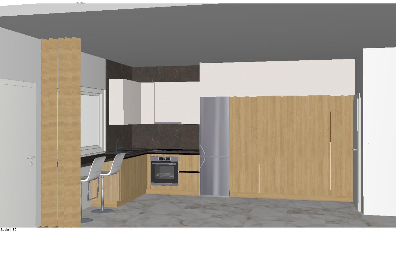 render a modern kitchen with a sleek design featuring warm oak wood cabinets and panels the countertops are a rich black granite providing a sharp contrast the appliances including a refrigerator stove and oven are finished in stainless steel adding a contemporary feel the bar stools are white with a minimalist design positioned along a glossy black breakfast bar the walls are painted a soft cream color while the floor is a polished light gray marble the overall atmosphere is bright and inviting with soft ambient lighting enhancing the coziness of the space add elegant distinctive elements over top tall units there is cabinets