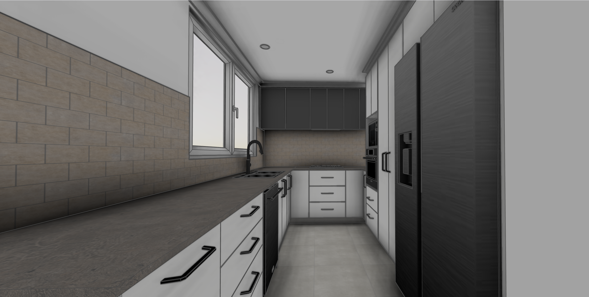 morning house set in residential area downlights 55mm cornice painted white ceiling and walls white under cabinet lighting to upper cabinets cabinet doors without profile maintain all colours from reference image tiles without texture ceramic