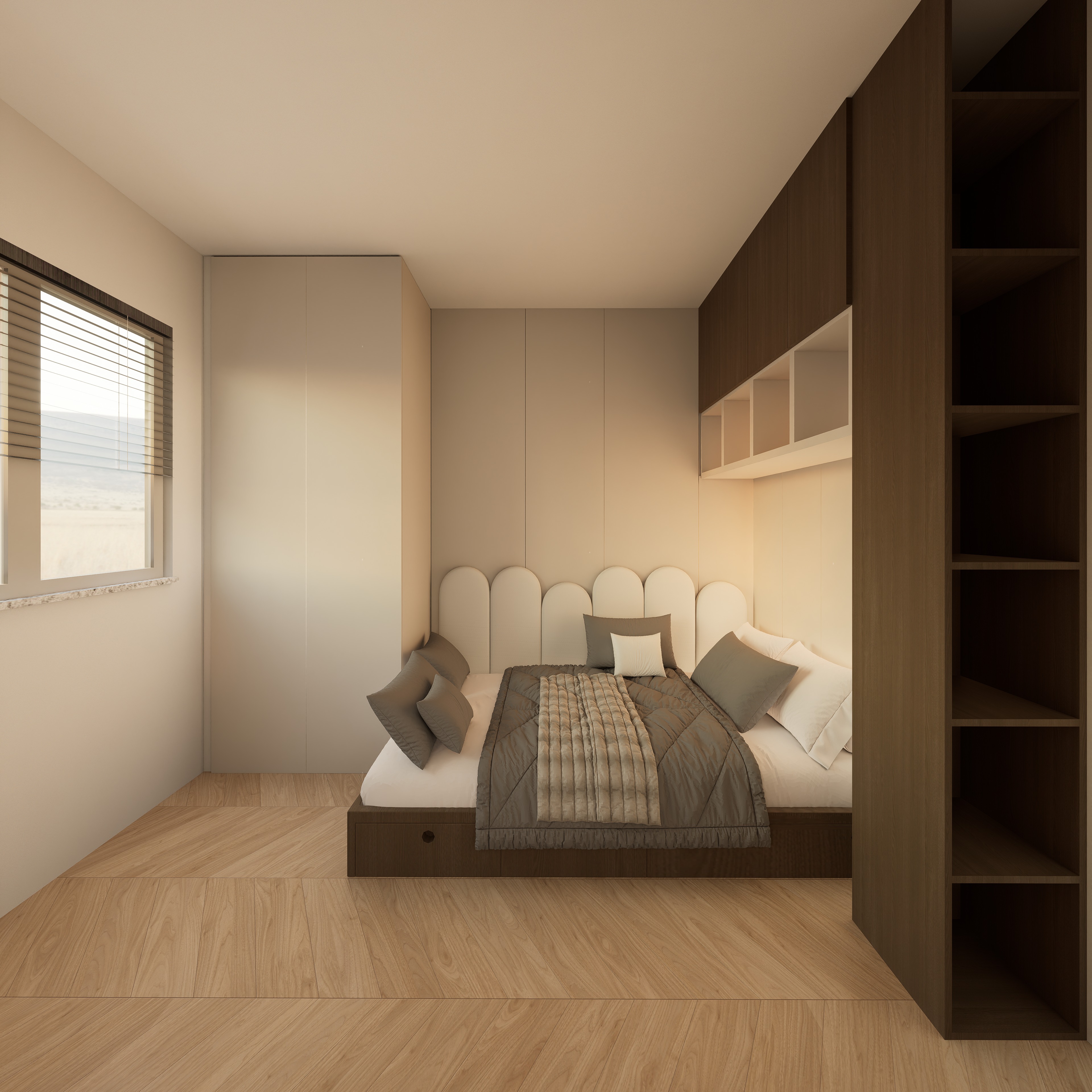 ultra high end photorealistic architectural interior render enhancement of this compact contemporary bedroom preserving the exact original design layout proportions camera angle composition bed placement wardrobe position shelving geometry wall paneling ceiling shape and overall architectural structure do not redesign or restyle the room the goal is to create a premium realistic elegant interior rendering while keeping the design faithful to the source image maintain the existing warm neutral palette and make the room feel visually consistent with the previous renders soft beige walls creamy upholstery warm oak flooring taupe and brown textile accents and dark wood millwork keep the bed design exactly the same including the rounded upholstered headboard panels bed base bedding arrangement and pillow placement enhance the bed with ultra realistic fabric detail subtle weave texture realistic folds soft creasing refined stitching and natural shadow depth keep the bedding luxurious soft and believable with a premium residential feel preserve the light wood floor exactly in tone plank direction and layout only improving realism with natural grain variation subtle satin reflection fine surface texture and physically accurate light response keep the dark wood shelving and millwork on the right side unchanged in geometry and finish but enrich it with realistic timber depth elegant grain visibility and a premium matte satin finish add modern accessories on the right shelves in a minimal curated high end way a few tasteful objects such as design books sculptural ceramics a small vase a refined decorative box and one or two elegant contemporary objects keep styling restrained architectural and luxurious not cluttered fix the window treatment by adding both soft curtains and venetian blinds integrated naturally and realistically the curtains should be full height or visually well proportioned to the window composition in a light neutral fabric with soft folds and elegant drape the venetian blinds should sit naturally within the window area minimal and refined with realistic slat scale let daylight filter through the blinds and curtains softly creating subtle layered shadow lines and a calm premium atmosphere keep the window design itself unchanged preserve the wardrobe and wall panels exactly as designed only enhancing material realism and shadow transitions keep the overhead shelving above the bed unchanged with improved realism and subtle depth lighting should feel like luxury interior photography soft natural daylight from the window balanced with warm ambient room light gentle indirect bounce refined ambient occlusion soft contact shadows and controlled highlights the render should feel clean warm intimate and expensive without becoming overly dramatic add fine real world realism through micro imperfections only slight roughness variation delicate fabric depth realistic wood pores soft edge definition and physically accurate material interaction the result should be magazine quality ultra detailed believable calm and sophisticated target style high end residential interior visualization luxury modern bedroom premium warm minimalism ultra photorealistic elegant architectural rendering soft daylight refined materiality negative instructions do not change the design do not change the layout do not change the bed shape do not move the furniture do not alter the wood tones do not redesign the wardrobe do not clutter the shelves do not add too many accessories do not add strong colors do not oversaturate do not create a stylized cgi look avoid plastic looking fabrics fake wood grain harsh shadows warped geometry and unrealistic reflections