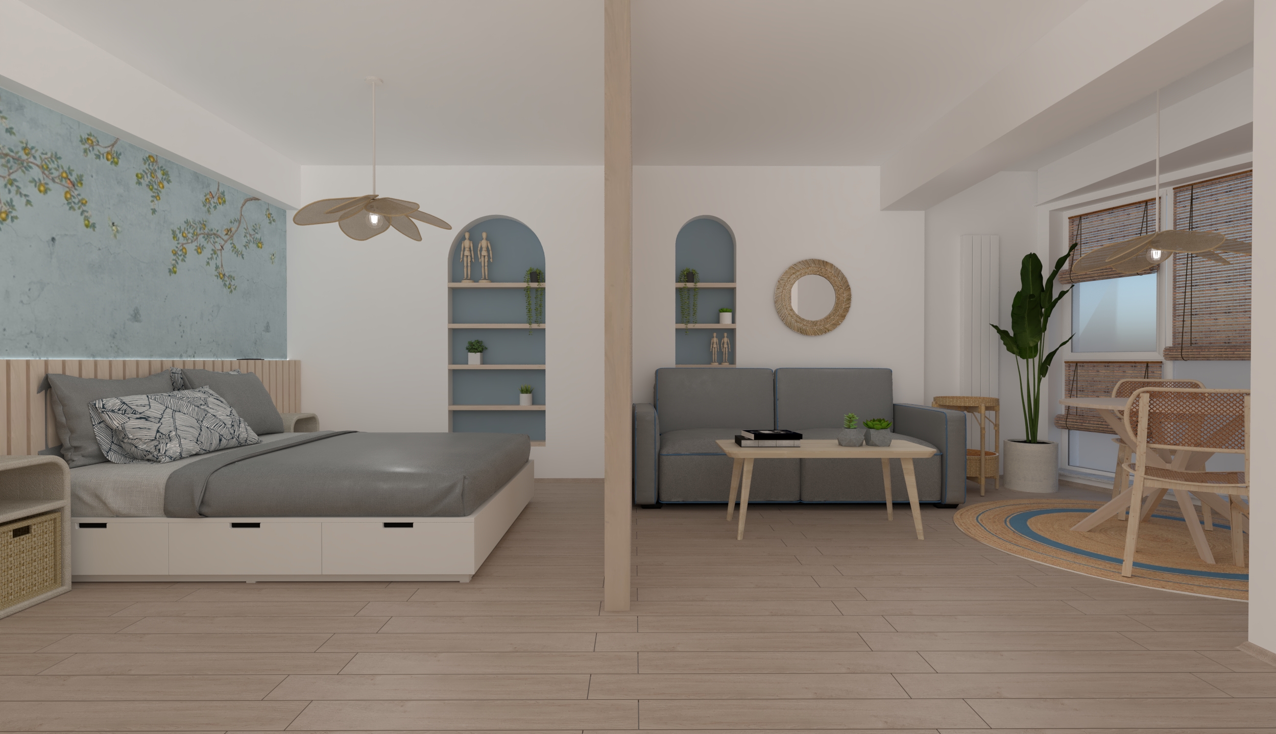 render a modern serene bedroom and living space with a scandinavian style the room features a partition dividing a comfortable bed with grey bedding and tropical patterned pillows from a cozy living area with a grey sofa include light wood flooring and a light beige partition the left wall showcases a soft blue mural with delicate floral branches while recessed shelves painted in the same blue display small green plants and beige decorative items the atmosphere is illuminated by two natural fiber pendant lights creating a warm and inviting ambience on the right a window with rolled bamboo blinds allows natural light to filter through while a potted green plant adds freshness to the room a round jute rug with blue accents defines the dining area with rattan furniture enhancing the overall natural and calming vibe