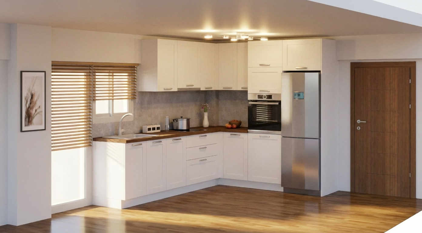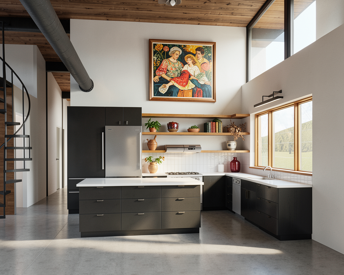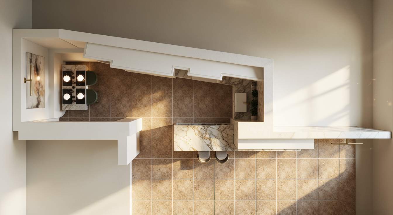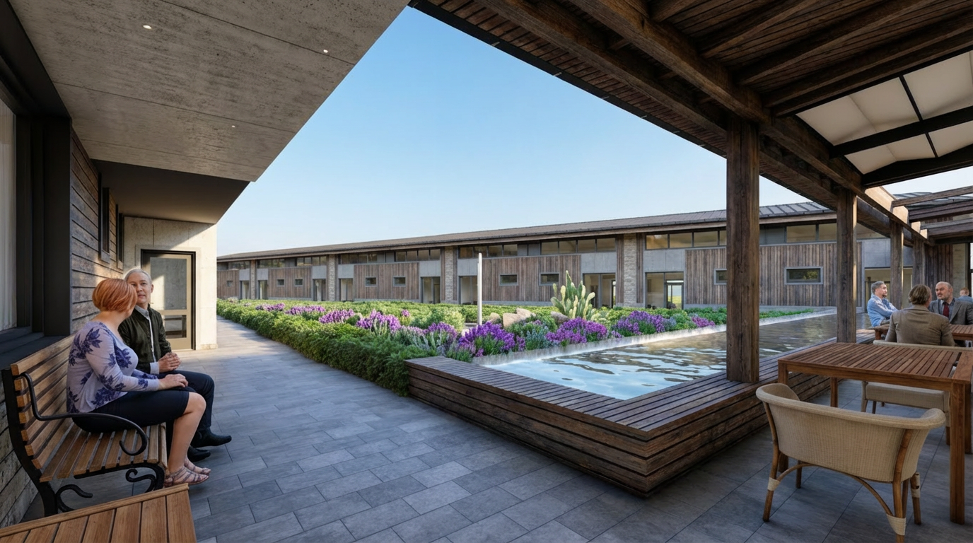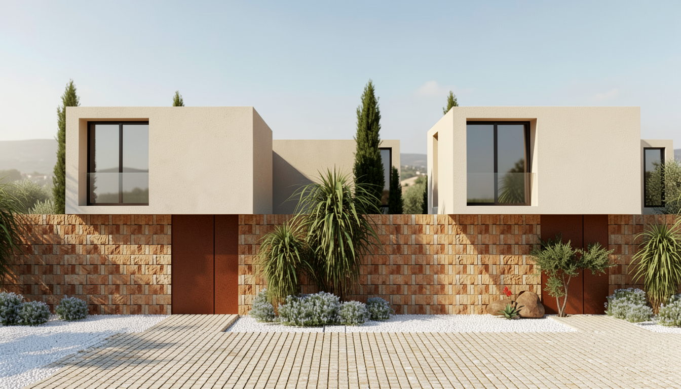 photorealistic exterior render strictly based on the original composition geometry proportions and camera unchanged add a clear sky and a soft mediterranean natural background with distant vegetation ground in light natural cobblestone paving with realistic joints and tonal variation garden areas in white gravel clean and naturally distributed wall cladding in rectangular clay pieces with warm earthy tones slightly irregular texture and subtle variation upper cubic volumes finished in beige stucco matte and softly textured enhance vegetation while preserving placement natural mediterranean species balanced greens no oversaturation poetic mediterranean atmosphere warm daylight soft shadows gentle contrast slight air haze hyperrealistic materials pbr correct roughness no plastic look editorial architectural style