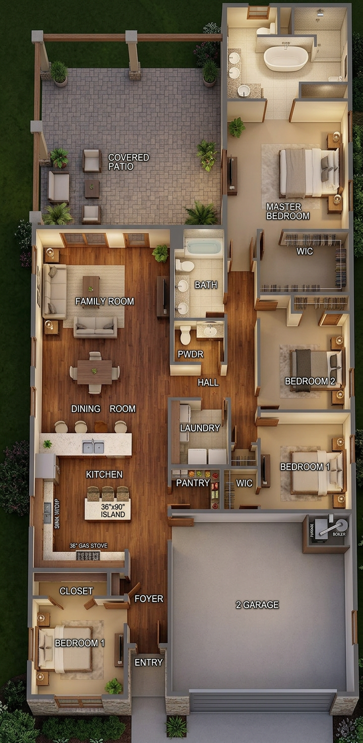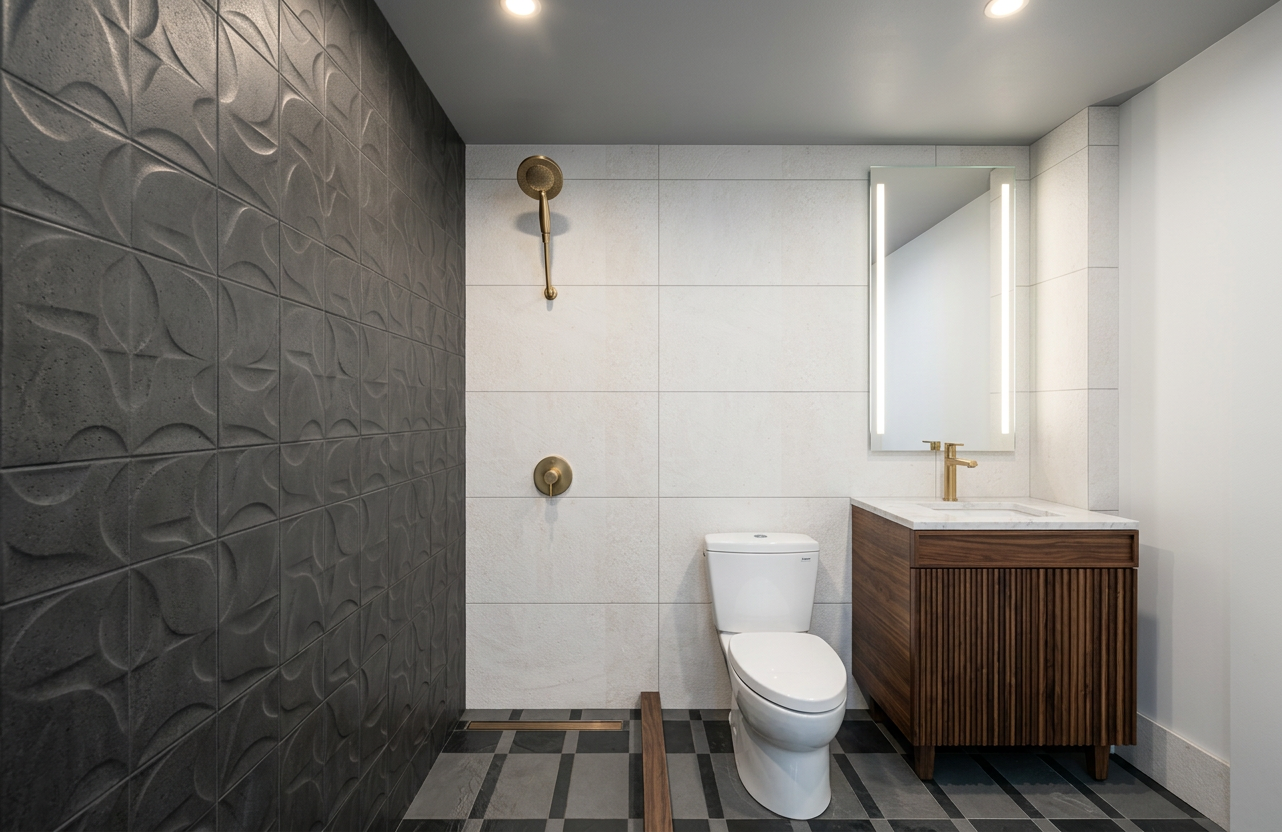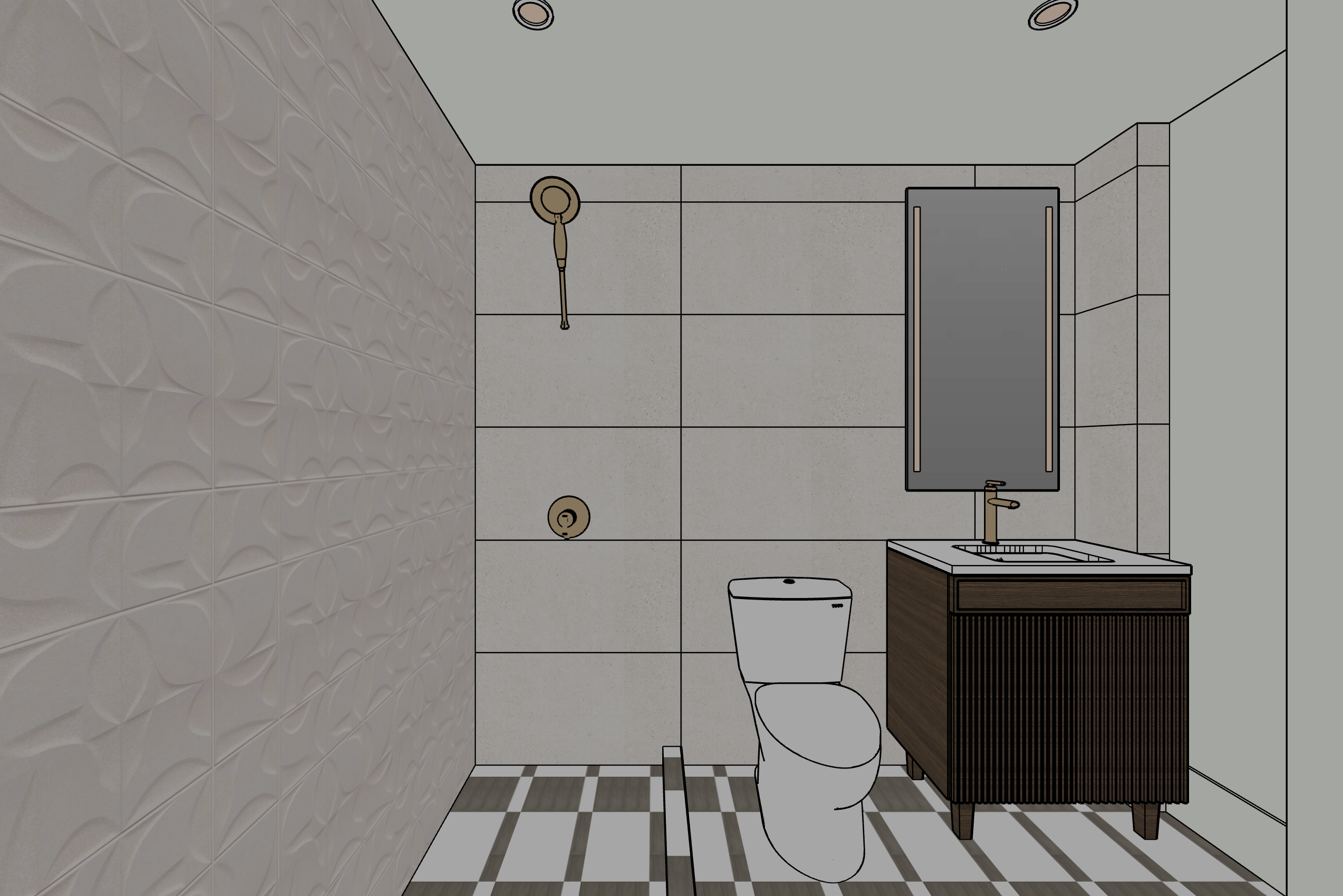 photorealistic enhancement of the provided architectural render preserve the exact architecture layout materials furniture placement and fixtures from the original image with no redesign or modifications the purpose is only to improve realism and lighting quality apply physically accurate global illumination and natural light behavior lighting should feel balanced and natural as in professional interior architectural photography soft indirect daylight fills the space with gentle light bounce from surrounding surfaces shadows are soft subtle and physically realistic with natural falloff all materials remain unchanged but respond to light more realistically stone surfaces with natural micro texture wood grain with depth matte flat painted walls with soft diffusion and brushed metal fixtures with correct reflections no surfaces emit light unless they are actual light fixtures plumbing fixtures such as shower heads and faucets must remain non emissive and only reflect ambient light metallic fixtures reflect light but never emit light the finishes should never have altered color or patterns render as high end interior photography using a full frame camera with a 24 35mm architectural lens balanced exposure realistic dynamic range subtle depth of field and natural color grading the image should look like a professionally photographed luxury interior rather than a computer render the scene should be bright but without unrealistic or unnecessary shows do not change architecture do not change materials no redesign no new objects no additional lights no glowing fixtures no light from shower heads or faucets no dramatic shadows no surreal lighting no warped geometry no stylization the plumbing fixtures and bathroom faucet should all be brushed brass the can lights in the ceiling should be emitting light and brightening the space the tile color and overall nature should not be altered the back wall tile should be white matte with subtle limestone texture the floor tile pattern should not change the led mirror should be turned on and shining light through the two light strips lastly the reflection in the mirror should show a solid white wall