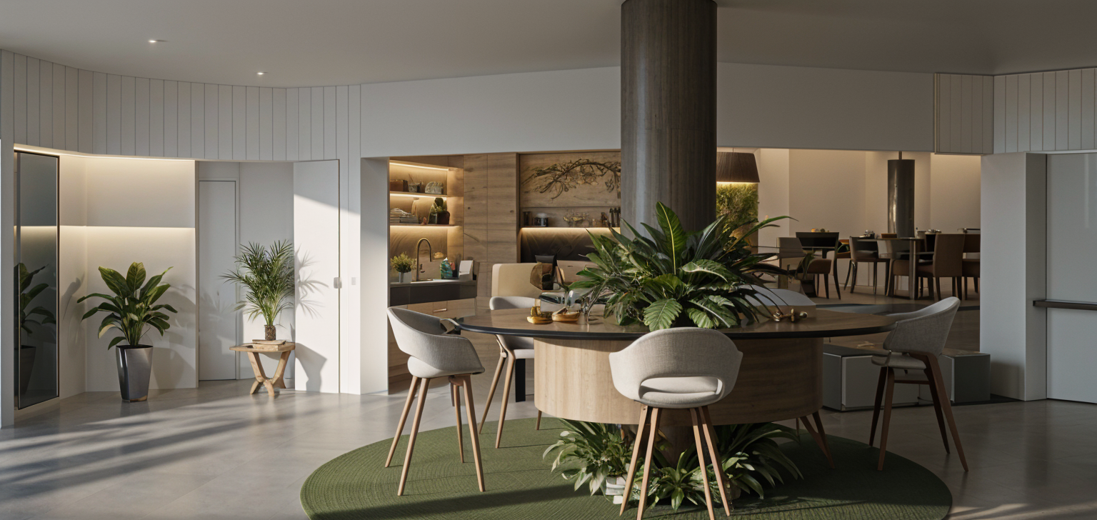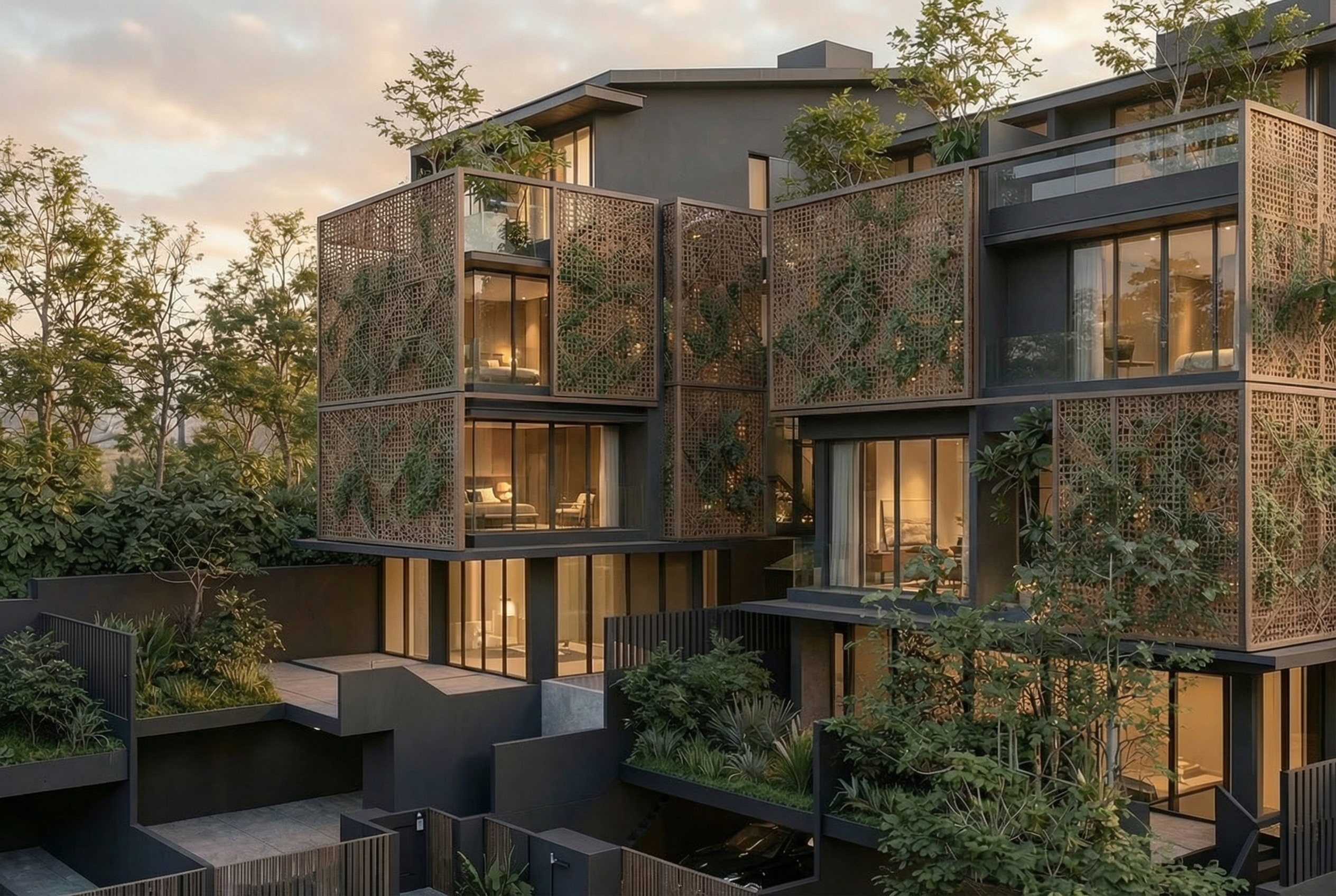 using the uploaded image as the locked base reference keep the building form proportions materials planting lighting and atmosphere unchanged focus only on the existing sub divided facade frame system open approximately 30 of the framed panels by sliding the inner screen layer backward behind the front frame creating subtle depth and layering the openings should feel quietly random and restrained avoid symmetry repetition or obvious patterns most panels remain closed with a smaller number gently opened to varying depths emphasise calm visual rhythm shadow variation and architectural elegance rather than contrast or drama ensure the overall facade composition remains refined balanced and luxurious with openings that feel intentional yet understated do not add new elements do not alter materials colours planting density or lighting only adjust the open closed condition and depth of the existing facade frame subdivisions
