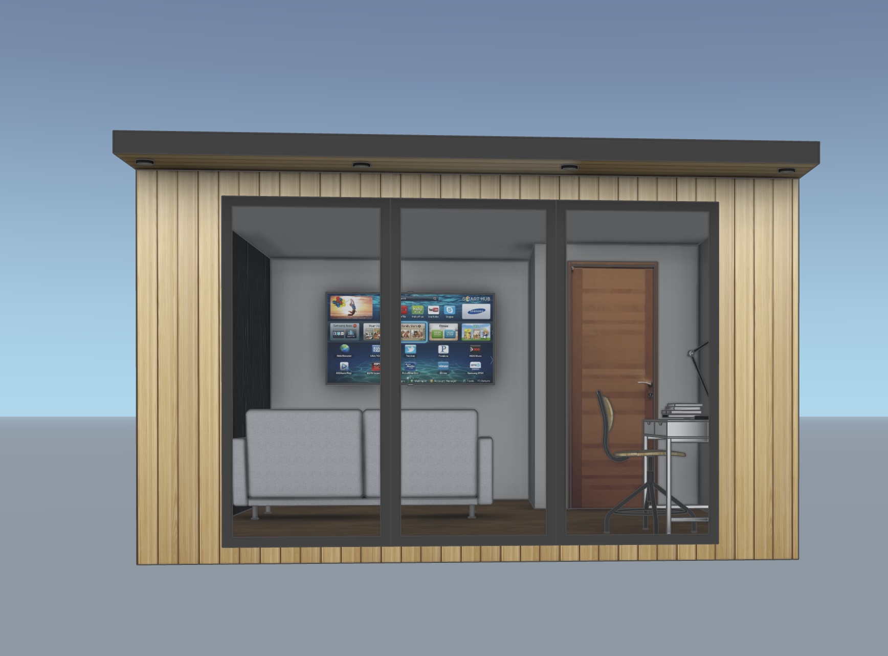 a small modern room with a sleek minimalist design the exterior features vertical wooden panels in a soft light oak color contrasting with the dark gray frame of large windows inside there is a plush light gray sofa facing a flat screen displaying vibrant digital content the back wall is dark almost black enhancing the digital display s colors a simple cozy office setup with a modern black desk lamp and a chair with wooden accents sits beside a warm wooden door the ambiance is calm and serene with soft natural lighting creating a welcoming atmosphere place in a modern small garden