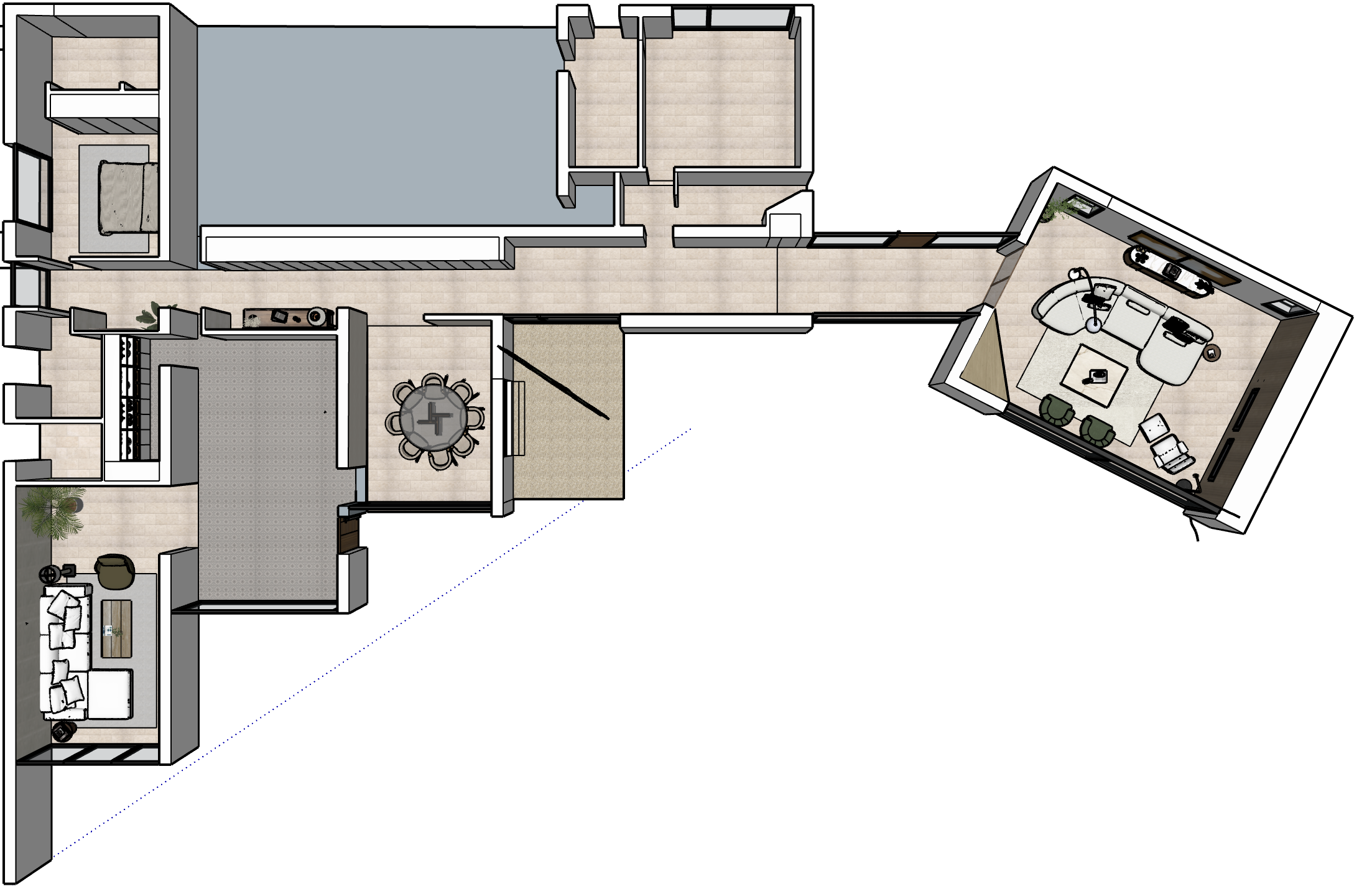 mejorar iluminaci n suelo comedor igual que el resto de la planta cocina en suelo de baldosa hidr ulica en blanco y gris en el espacio a continuaci n el cual tiene las mismas dimensiones que el comedor son piedras de pinoncillo con una copa de rbol vista desde arriba el lugar gris de arriba es la cochera agregar dos autos aparcados