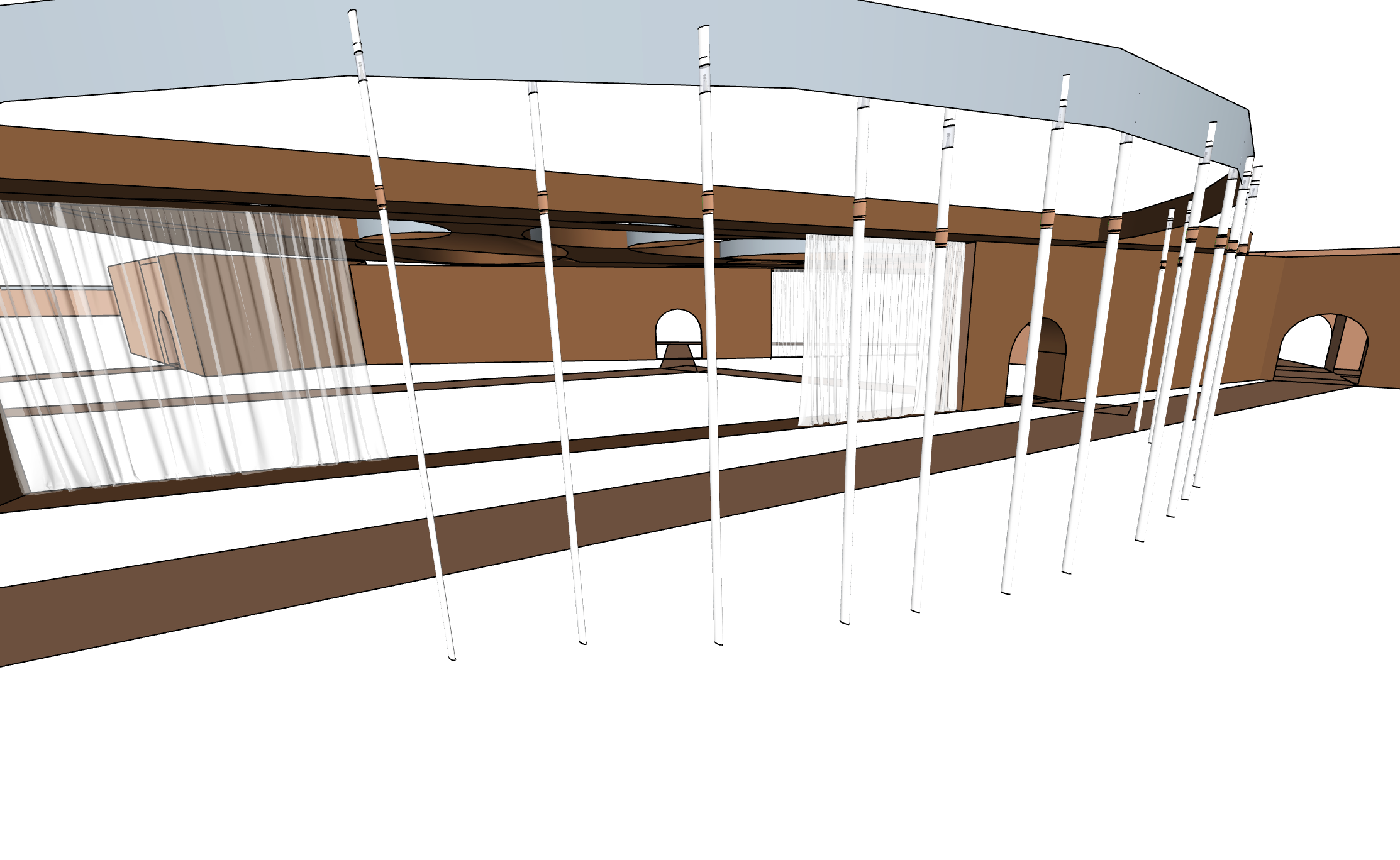 sustainable design exterior shot circled arch with thin columns materials are corten steel and wood ther are also curtains do not add nothing just render what you see with 100 accuracy architecture